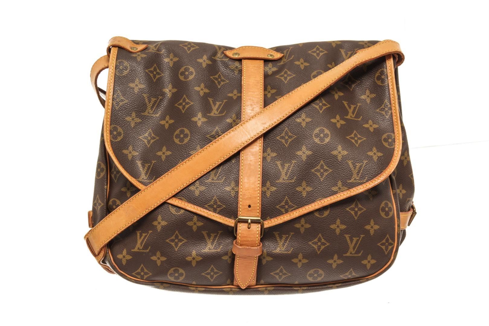 One Louis Vuitton Brown Monogram Canvas Saumur 35 Shoulder Bag. Item is sold AS-IS. All available information is listed in the description and shown in the photo. louis vuitton brown monogram canvas saumur 35 shoulder bag with adjustable shoulder strap, a main internal compartment, an internal slip pocket, a front logo patch, a monogram pattern, side buckle fastenings, strap closures with a buckle fastenings Width 13.4 in, Height 12.2 in, Depth 9.4 in, Strap 20.1 in / Width 34 cm, Height 31 cm, Depth 24 cm, Strap 51 cm