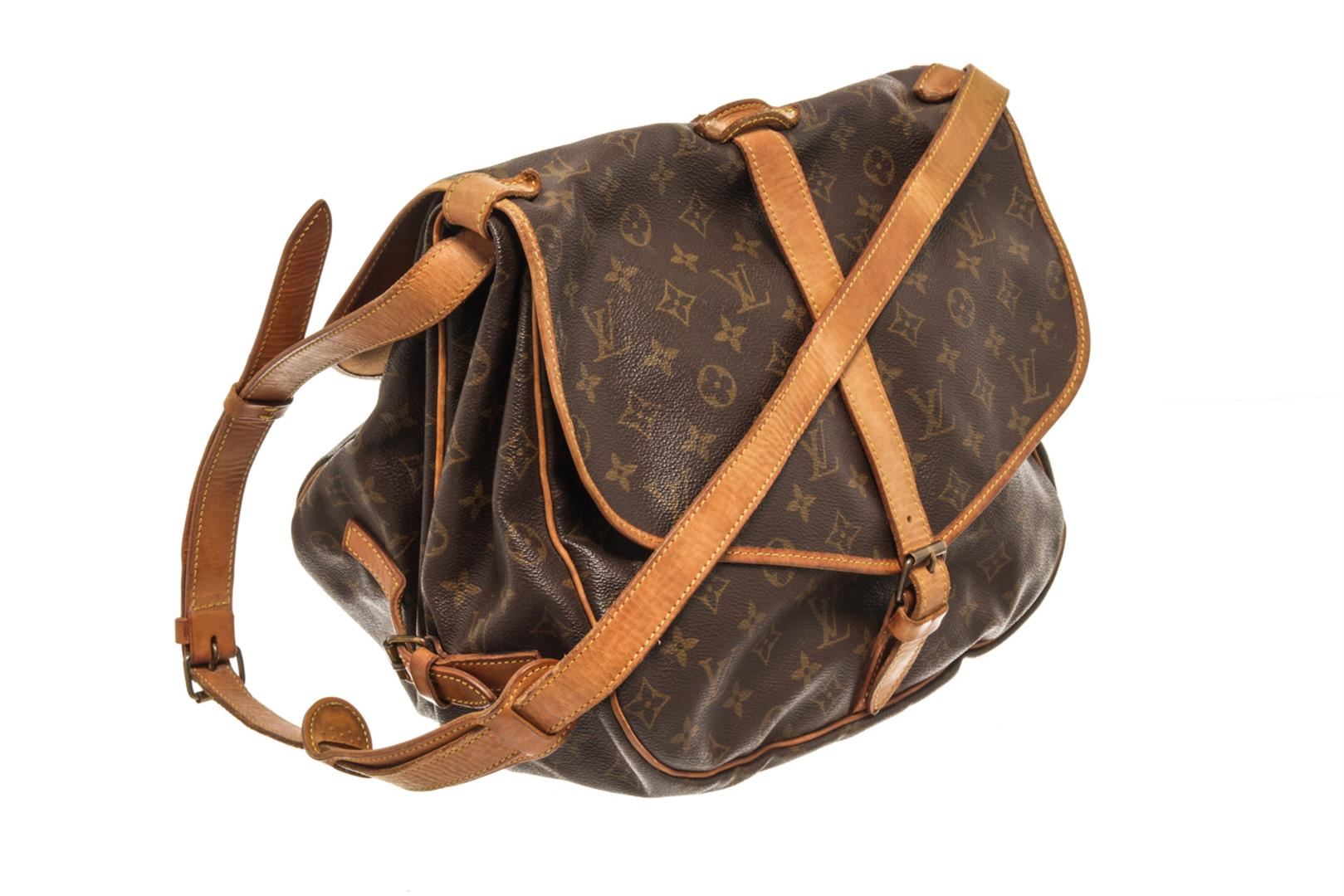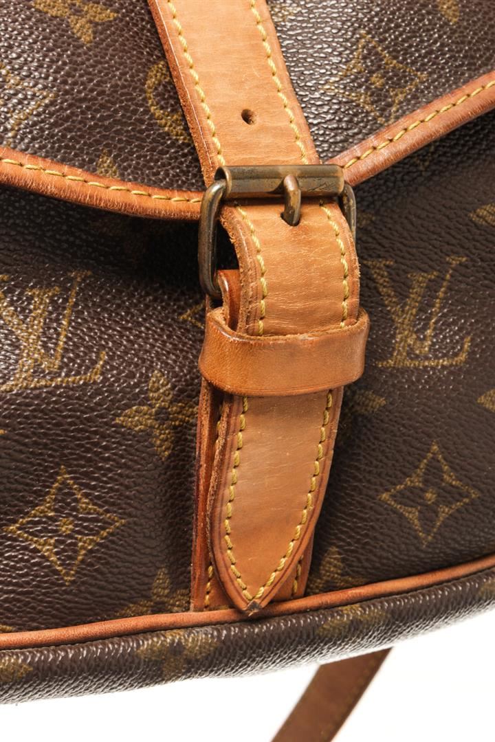 One Louis Vuitton Brown Monogram Canvas Saumur 35 Shoulder Bag. Item is sold AS-IS. All available information is listed in the description and shown in the photo. louis vuitton brown monogram canvas saumur 35 shoulder bag with adjustable shoulder strap, a main internal compartment, an internal slip pocket, a front logo patch, a monogram pattern, side buckle fastenings, strap closures with a buckle fastenings Width 13.4 in, Height 12.2 in, Depth 9.4 in, Strap 20.1 in / Width 34 cm, Height 31 cm, Depth 24 cm, Strap 51 cm