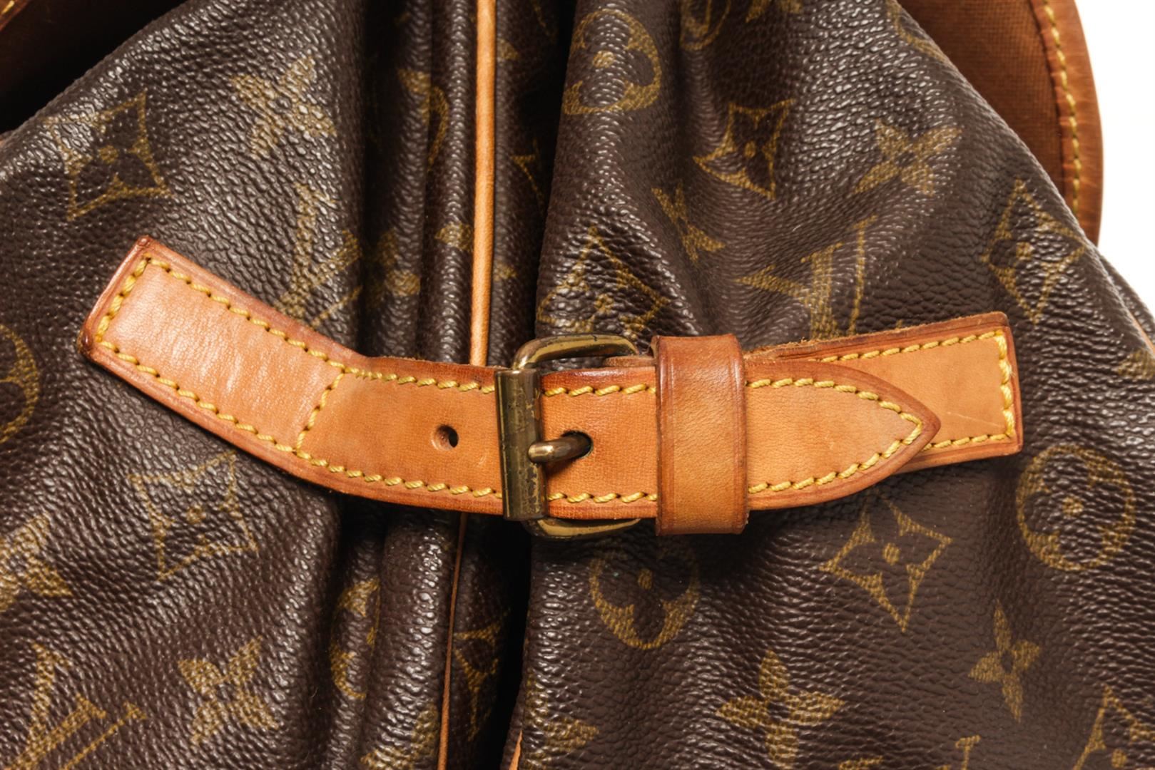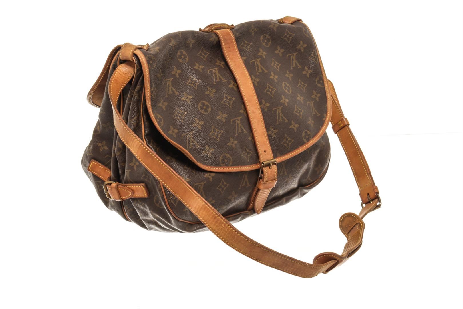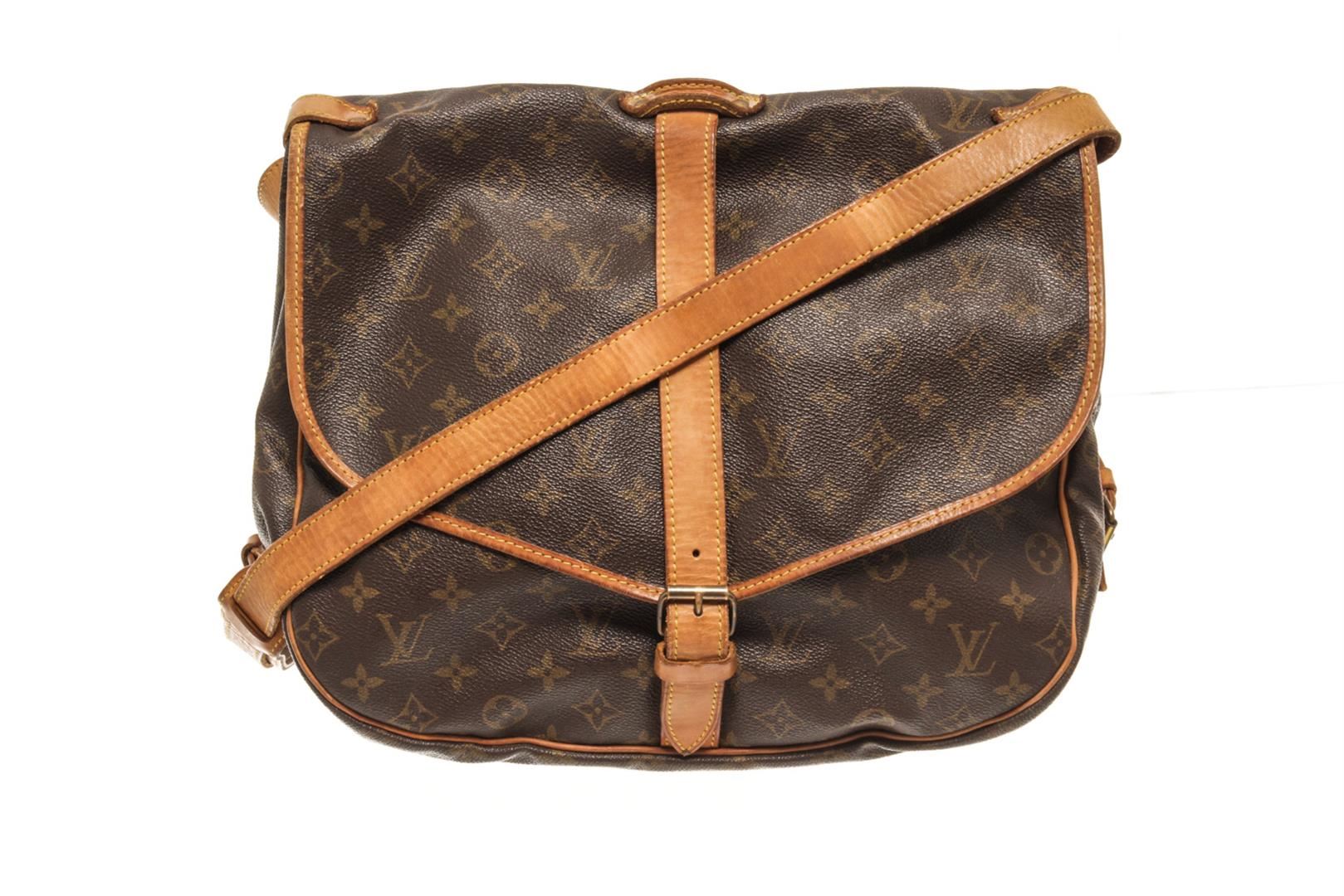 One Louis Vuitton Brown Monogram Canvas Saumur 35 Shoulder Bag. Item is sold AS-IS. All available information is listed in the description and shown in the photo. louis vuitton brown monogram canvas saumur 35 shoulder bag with adjustable shoulder strap, a main internal compartment, an internal slip pocket, a front logo patch, a monogram pattern, side buckle fastenings, strap closures with a buckle fastenings Width 13.4 in, Height 12.2 in, Depth 9.4 in, Strap 20.1 in / Width 34 cm, Height 31 cm, Depth 24 cm, Strap 51 cm
