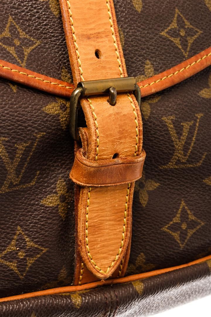 Louis Vuitton Brown Monogram Canvas Saumur 35cm Shoulder Bag. All available information is listed in the description and shown in the photos. Louis Vuitton Brown Monogram Canvas Saumur 35cm Shoulder Bag with brass hardware, leather trim, single adjustable shoulder strap, leather trim embellishment, canvas lining & three interior pockets, buckle closures at front & back. Height: 13" Width: 12.75" Depth: 3.25", Shoulder Strap Drop: 17.75" / 33.02 x 32.38 x 8.25 Cm