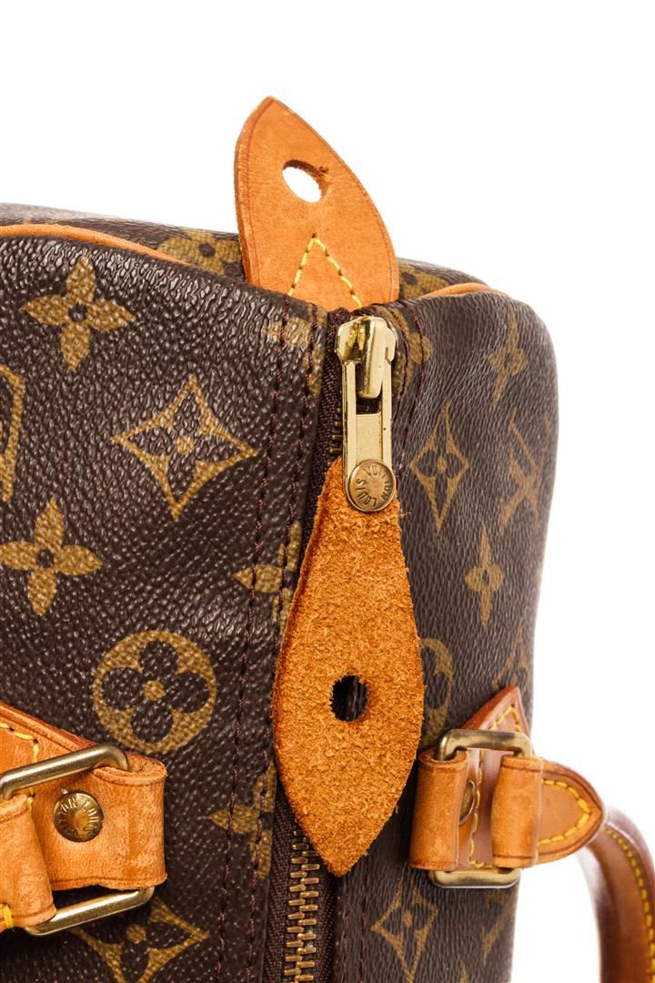 Louis Vuitton Brown Monogram Canvas Speedy 30 Satchel Bag. All available information is listed in the description and shown in the photos. Louis Vuitton Brown Monogram Canvas Speedy 30 Satchel Bag with brass hardware, leather trim, dual rolled handles, leather trim embellishment, canvas lining & single interior pocket, zip closure at top. Height: 8.5" Width: 12" Depth: 7", Handle Drop: 4" / 21.59 x 30.48 x 17.78 Cm