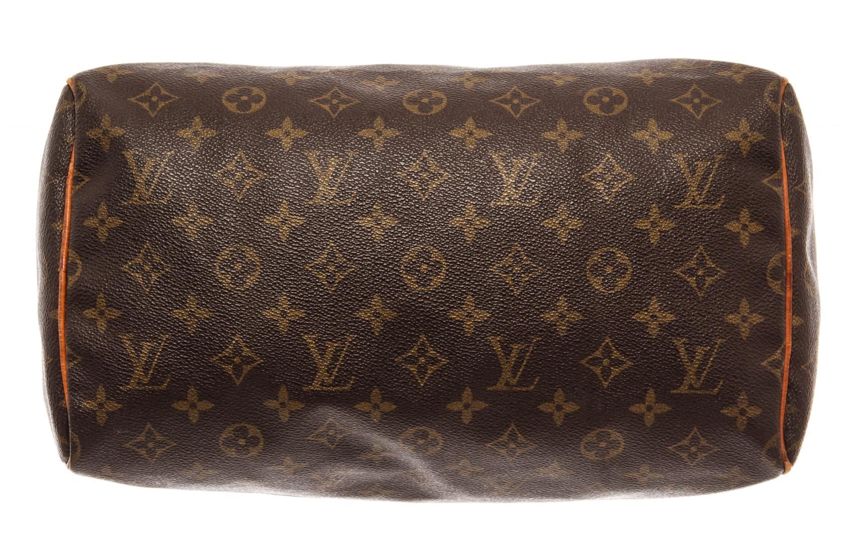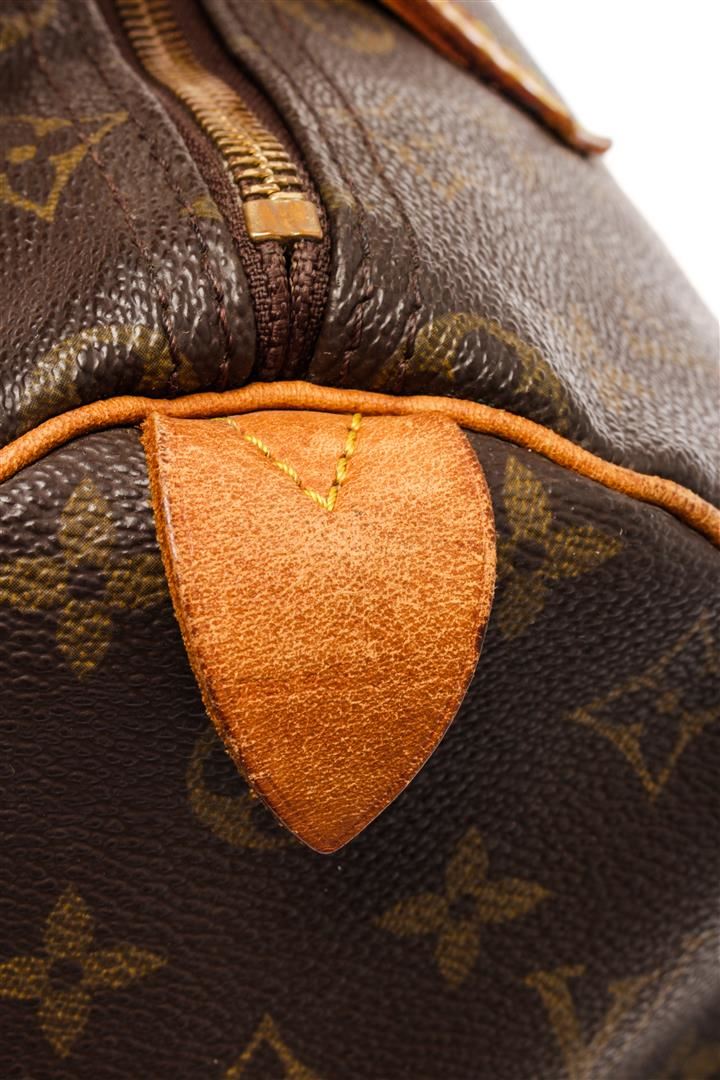 Louis Vuitton Brown Monogram Canvas Speedy 30 Satchel Bag. All available information is listed in the description and shown in the photos. Louis Vuitton Brown Monogram Canvas Speedy 30 Satchel Bag with brass hardware, leather trim, rolled handles & single shoulder strap, leather trim embellishment, canvas lining & single interior pocket, zip closure at top. Height: 9.5" Width: 11.5" Depth: 7", Shoulder Strap Drop: 3" / 24.13 x 29.21 x 17.78 Cm