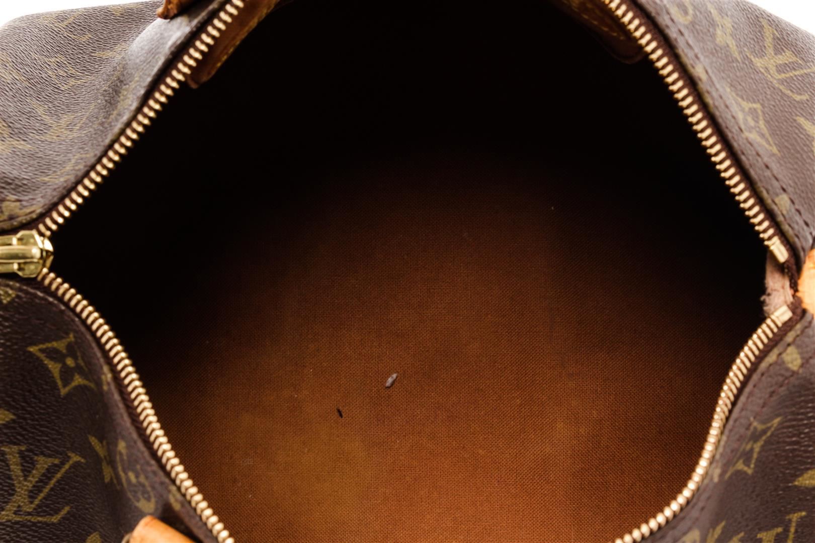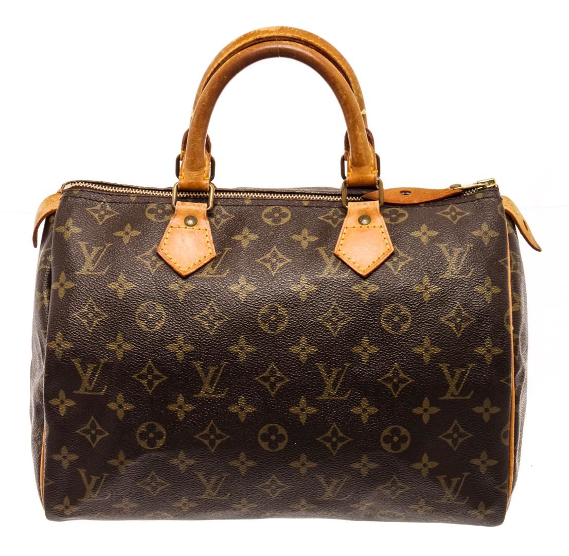 Louis Vuitton Brown Monogram Canvas Speedy 30 Satchel Bag. All available information is listed in the description and shown in the photos. Louis Vuitton Brown Monogram Canvas Speedy 30 Satchel Bag with gold-tone hardware, internal slip pocket, leather trim, two rolled top handles, main compartment top zip fastening. Height: 9.8 in (24.9 cm), Width: 15 in (38.1 cm), Depth: 7.5 in (19.05 cm)