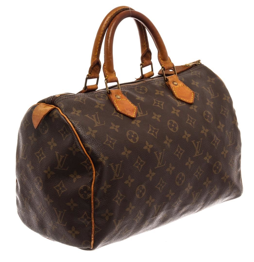 Louis Vuitton Brown Monogram Canvas Speedy 30 Satchel Bag. All available information is listed in the description and shown in the photos. Louis Vuitton Brown Monogram Canvas Speedy 30 Satchel Bag with brass hardware, leather trim, rolled handles & single shoulder strap, leather trim embellishment, canvas lining & single interior pocket, zip closure at top. Height: 9.5" Width: 11.5" Depth: 7", Shoulder Strap Drop: 3" / 24.13 x 29.21 x 17.78 Cm