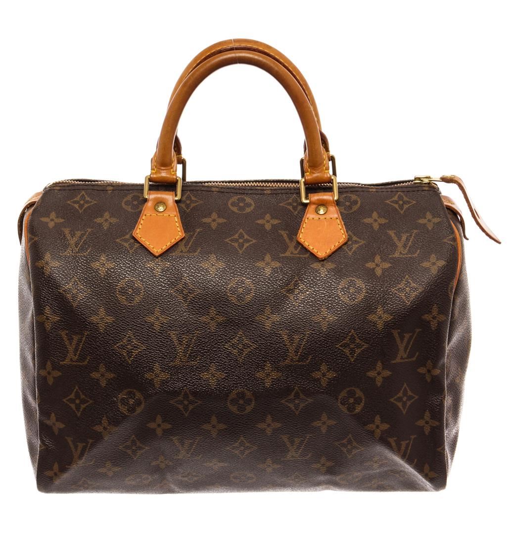 Louis Vuitton Brown Monogram Canvas Speedy 30 Satchel Bag. All available information is listed in the description and shown in the photos. Louis Vuitton Brown Monogram Canvas Speedy 30 Satchel Bag with brass hardware, leather trim, rolled handles, leather trim embellishment, canvas lining & single interior pocket, zip closure at top. Height: 8.5" Width: 12" Depth: 6.5", Handle Drop: 3.25" / 21.59 x 30.48 x 16.51 Cm