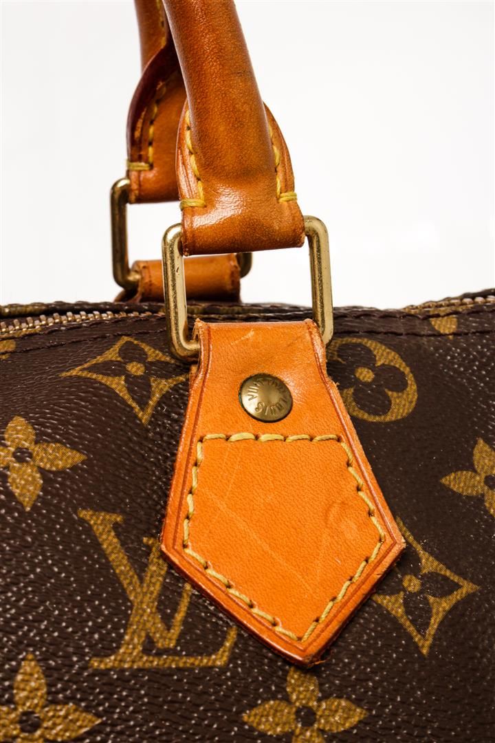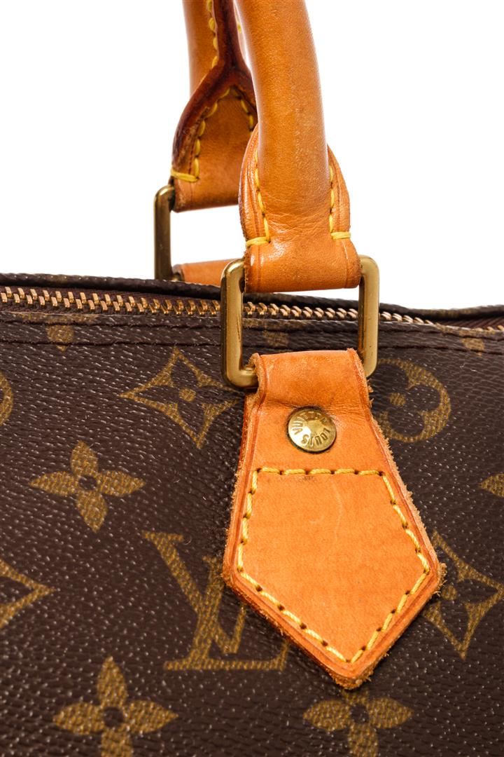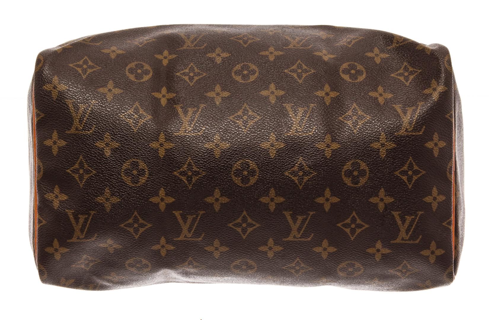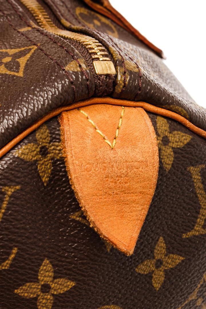 Louis Vuitton Brown Monogram Canvas Speedy 30 Satchel Bag. All available information is listed in the description and shown in the photos. Louis Vuitton Brown Monogram Canvas Speedy 30 Satchel Bag with brass hardware, leather trim, rolled handles, leather trim embellishment, canvas lining & single interior pocket, zip closure at top. Height: 8.5" Width: 12" Depth: 6.5", Handle Drop: 3.25" / 21.59 x 30.48 x 16.51 Cm