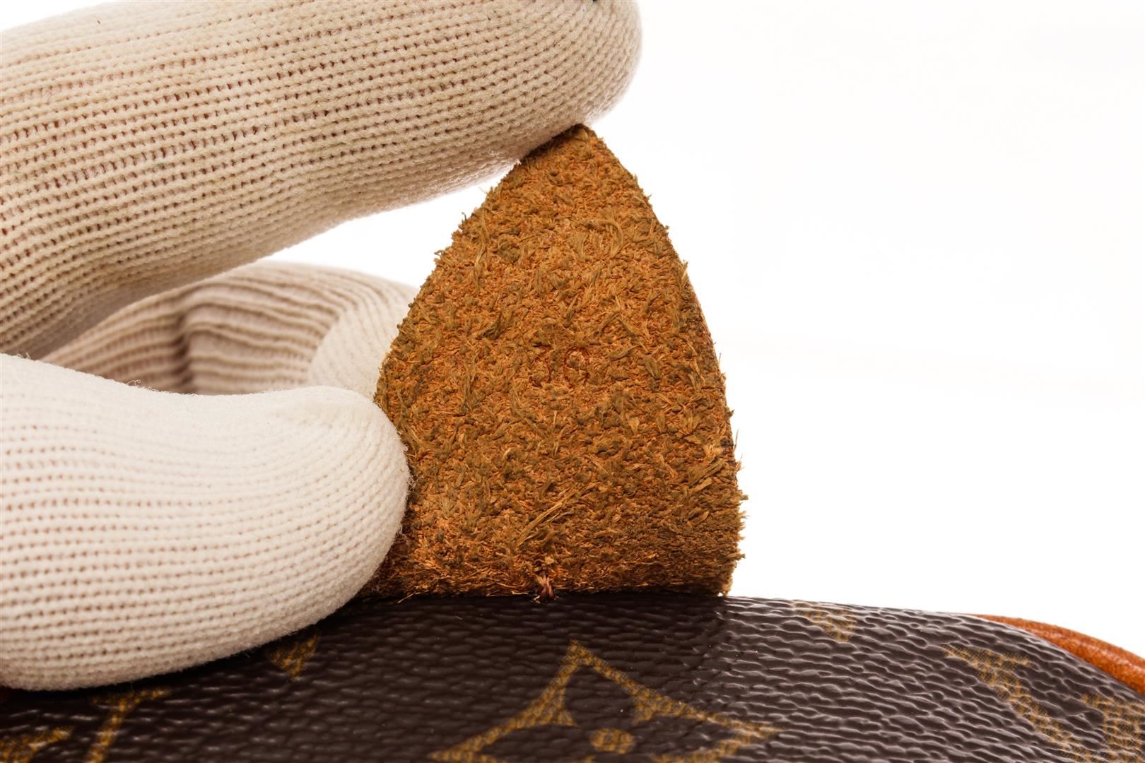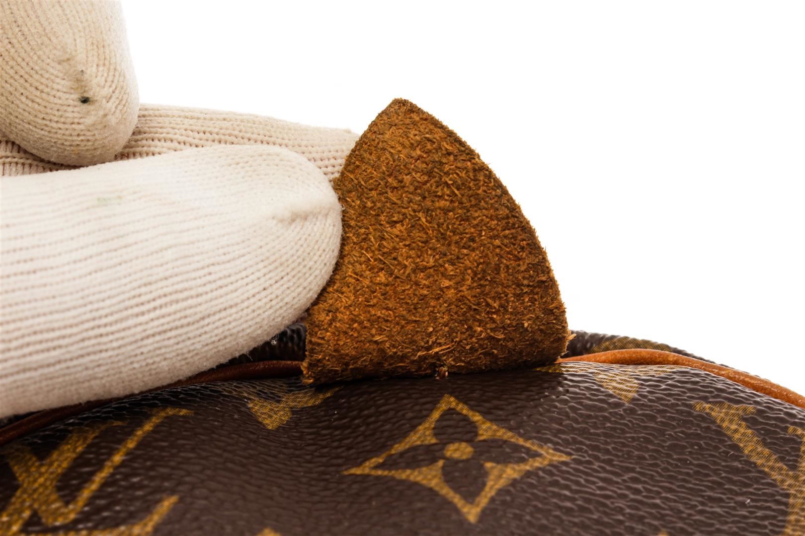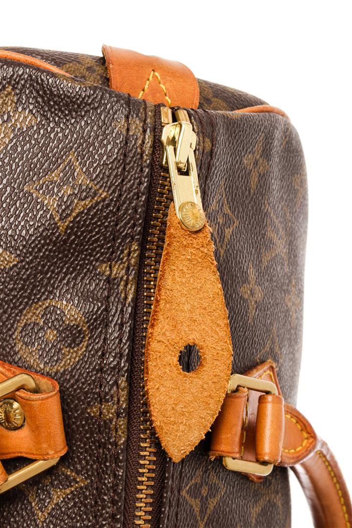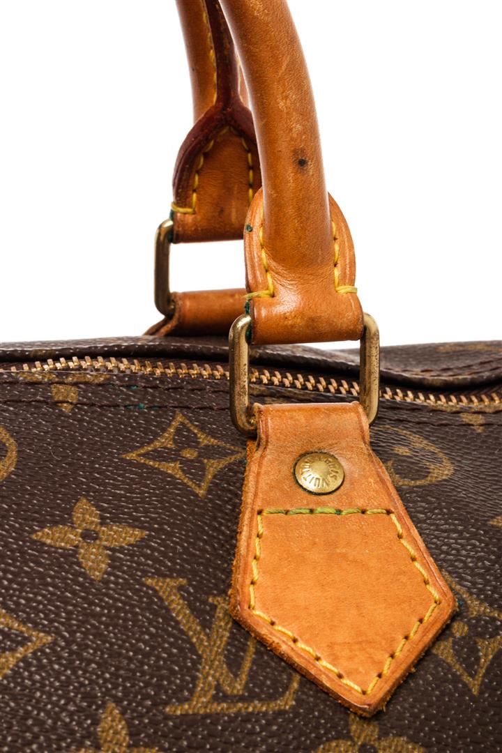 Louis Vuitton Brown Monogram Canvas Speedy 30 Satchel Bag. All available information is listed in the description and shown in the photos. Louis Vuitton Brown Monogram Canvas Speedy 30 Satchel Bag with brass hardware, leather trim, rolled handles, leather trim embellishment, canvas lining & single interior pocket, zip closure at top. Height: 8.5" Width: 12" Depth: 6.5", Handle Drop: 3.25" / 21.59 x 30.48 x 16.51 Cm
