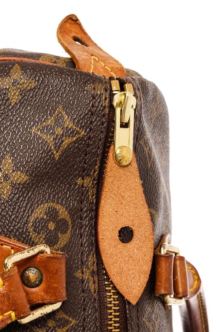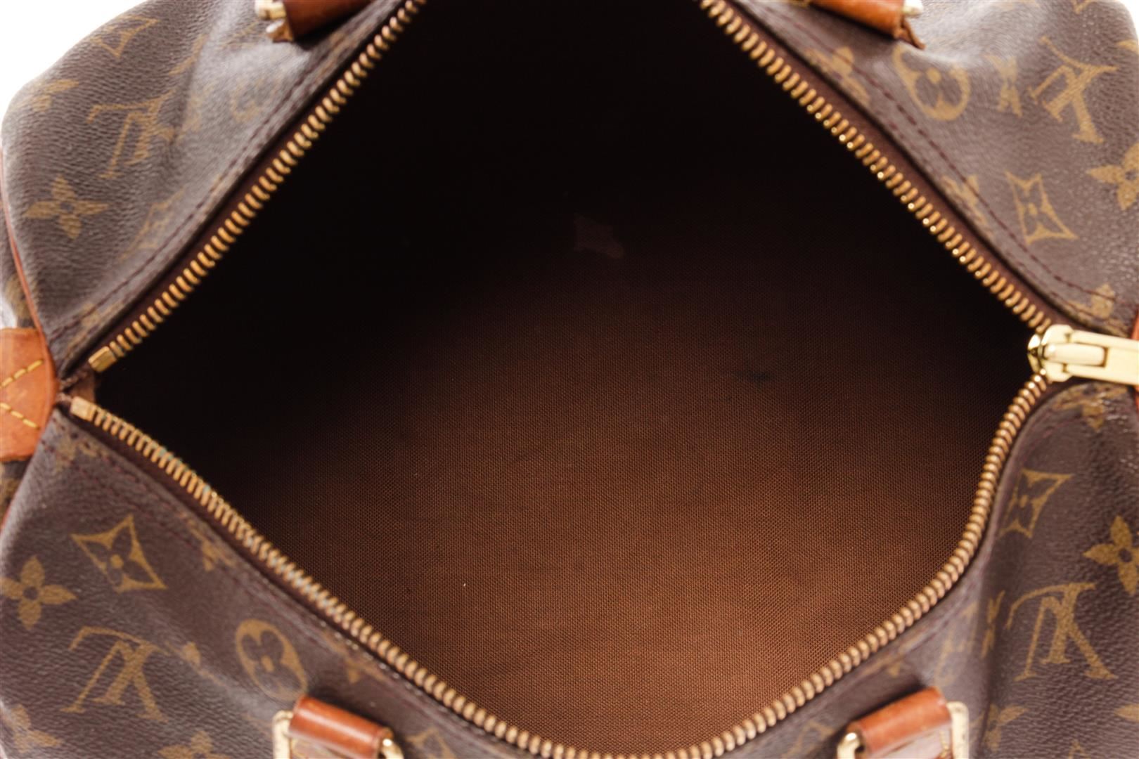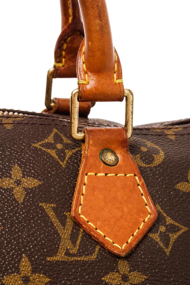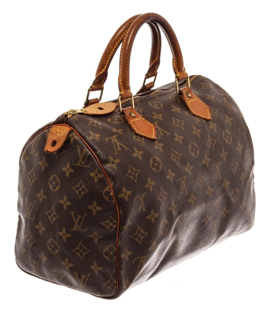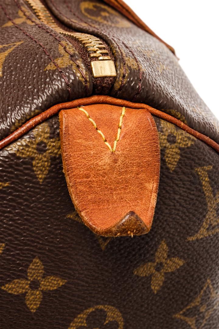 Louis Vuitton Brown Monogram Canvas Speedy 30 Satchel Bag. All available information is listed in the description and shown in the photos. Louis Vuitton Brown Monogram Canvas Speedy 30 Satchel Bag with brass hardware, leather trim, rolled handles, canvas lining & single interior pocket, zip closure at top. Height: 10" Width: 12" Depth: 6.75", Handle Drop: 3" / 25.4 x 30.48 x 17.14 Cm