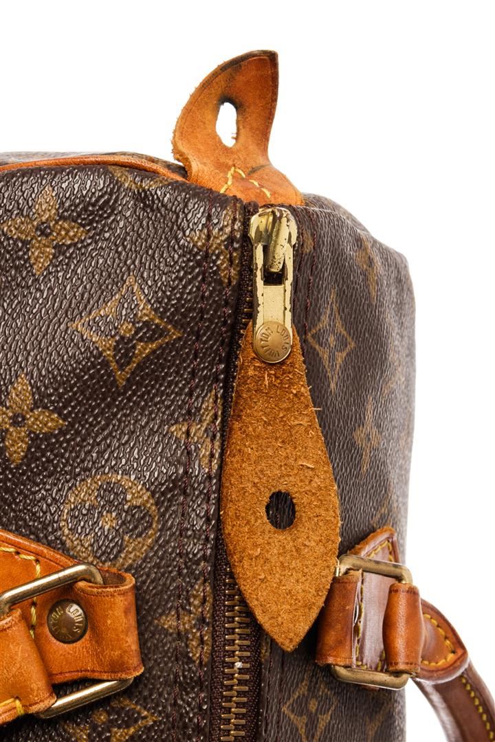Louis Vuitton Brown Monogram Canvas Speedy 30 Satchel Bag. All available information is listed in the description and shown in the photos. Louis Vuitton Brown Monogram Canvas Speedy 30 Satchel Bag with brass hardware, leather trim, dual rolled handles, canvas lining & single interior pocket, zip closure at top. Height: 10.5" Width: 12" Depth: 6.5", Handle Drop: 3.5" / 26.67 x 30.48 x 16.51 Cm