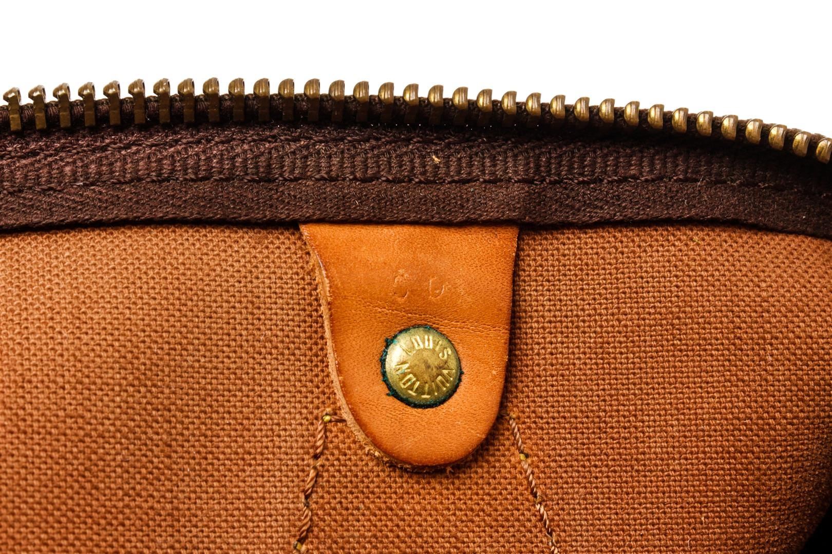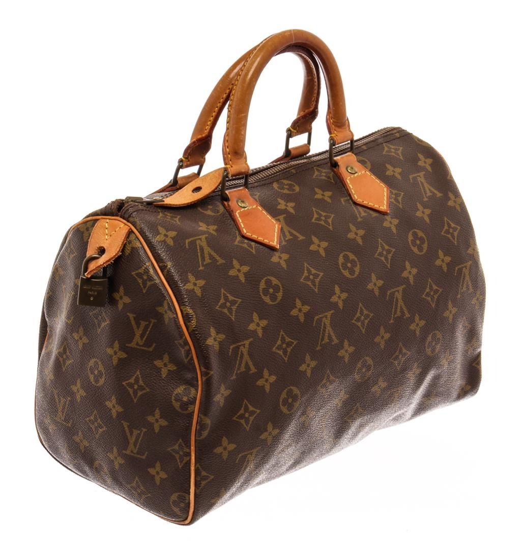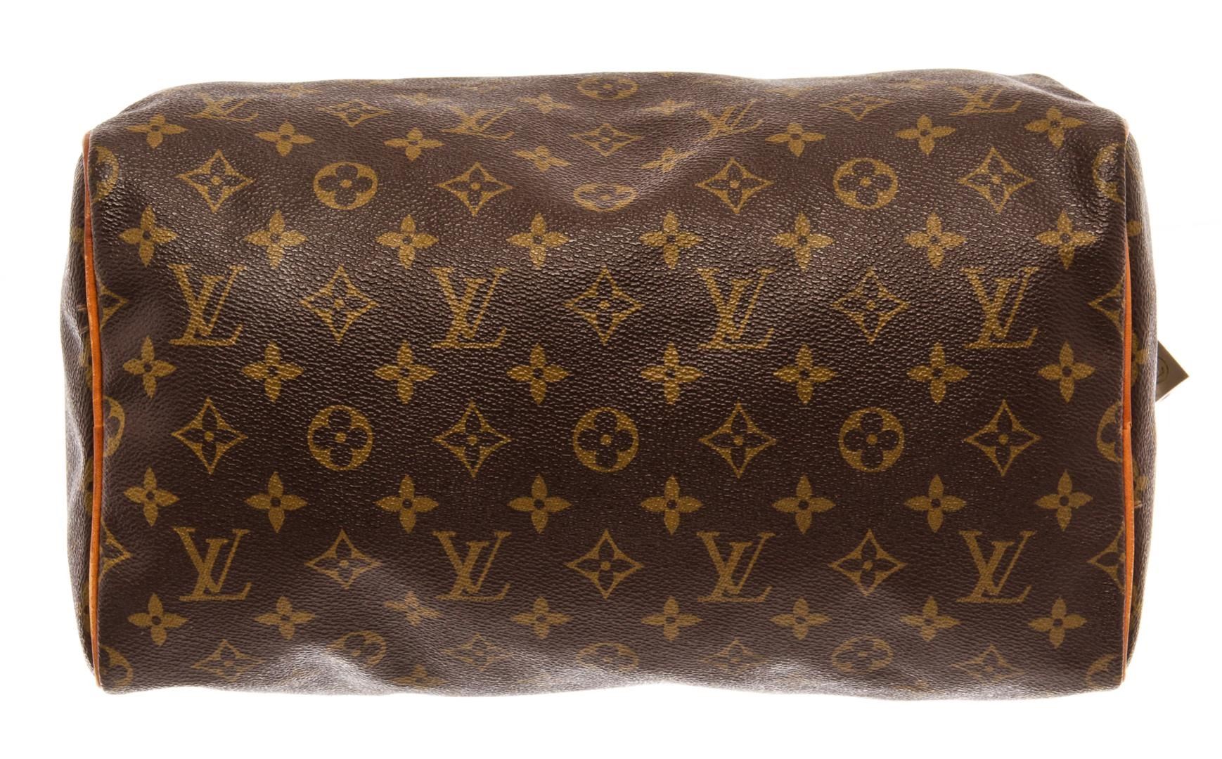Louis Vuitton Brown Monogram Canvas Speedy 30cm Satchel Bag. All available information is listed in the description and shown in the photos. Louis Vuitton Brown Monogram Canvas Speedy 30cm Satchel Bag with gold-tone hardware, leather trim, rolled handles, leather trim embellishment, canvas lining & single interior pocket, zip closure at top. Height: 8.75" Width: 11.75" Depth: 7", Handle Drop: 3.5" / 22.22 x 29.84 x 17.78 Cm
