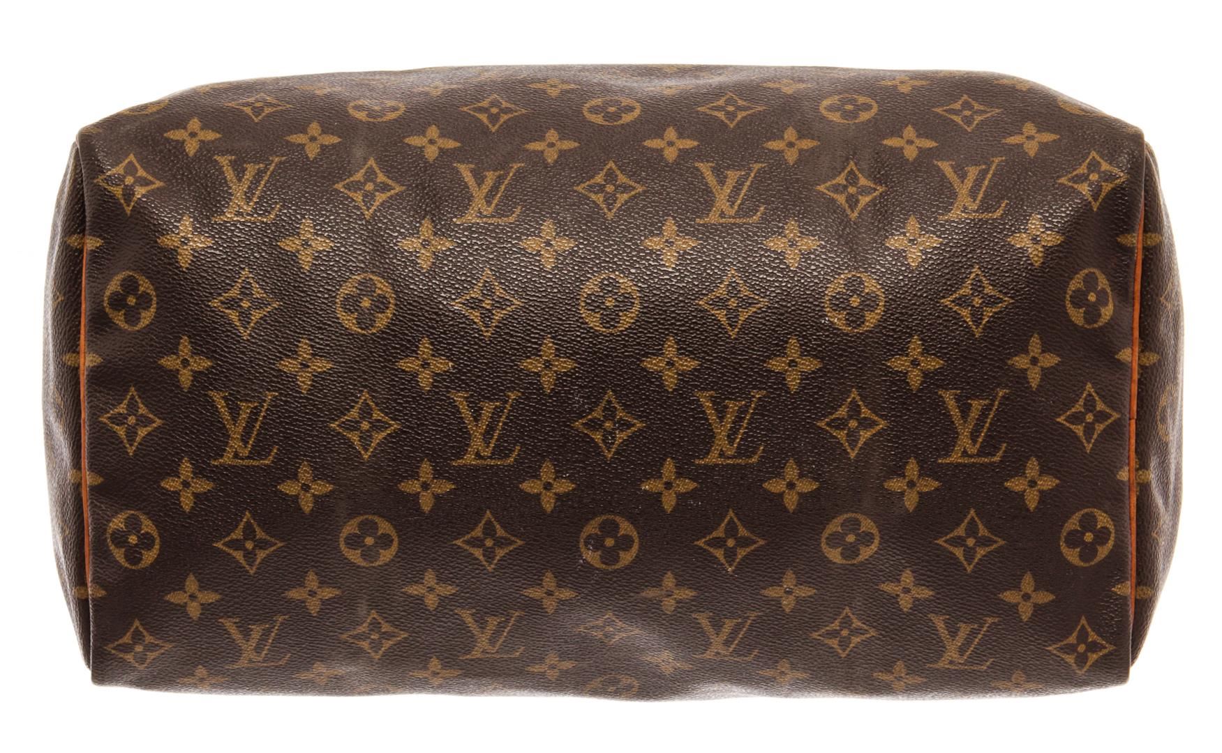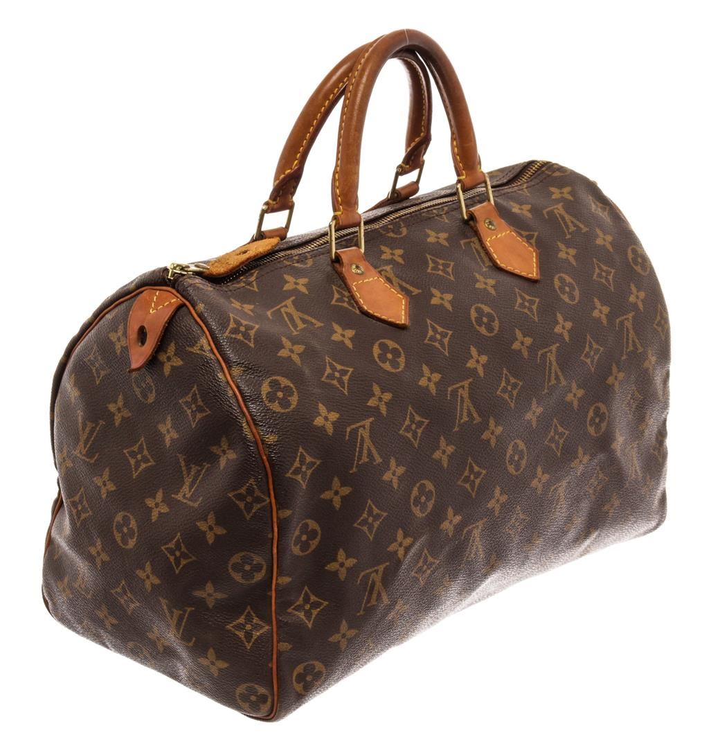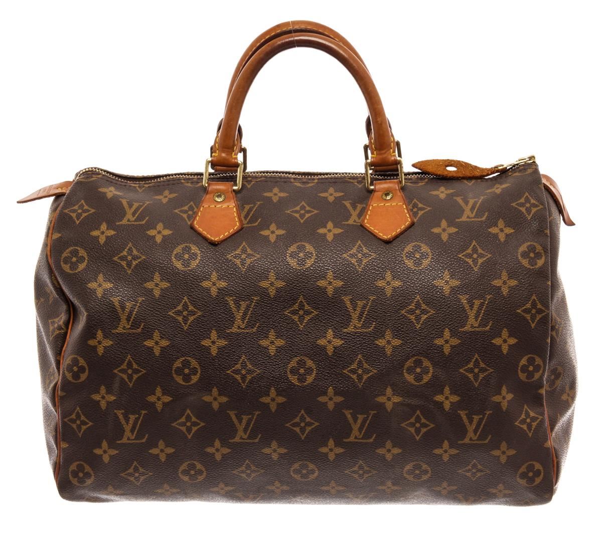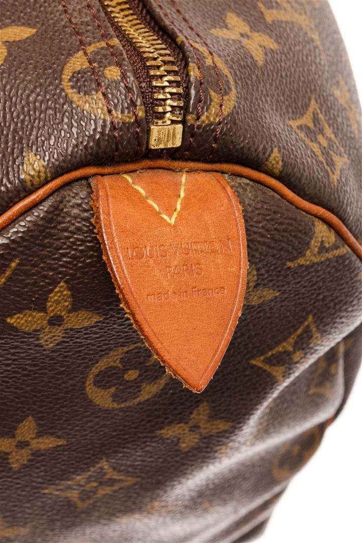 Louis Vuitton Brown Monogram Canvas Speedy 35 Satchel Bag. All available information is listed in the description and shown in the photos. Louis Vuitton Brown Monogram Canvas Speedy 35 Satchel Bag with brass hardware, dual rolled handles, leather trim embellishment, canvas lining & single interior pocket, zip closure at top. Height: 10.25" Width: 13.75" Depth: 7", Handle Drop: 3.75" / 26.03 x 34.92 x 17.78 Cm