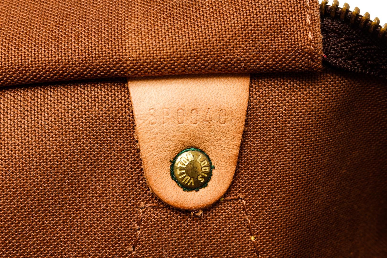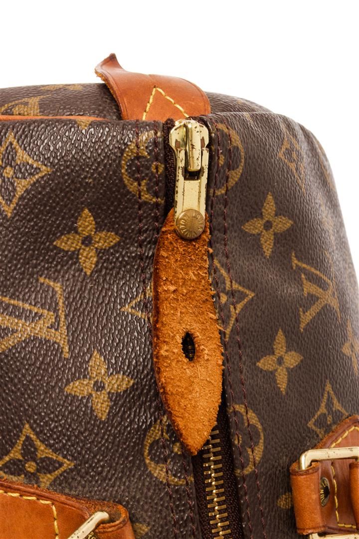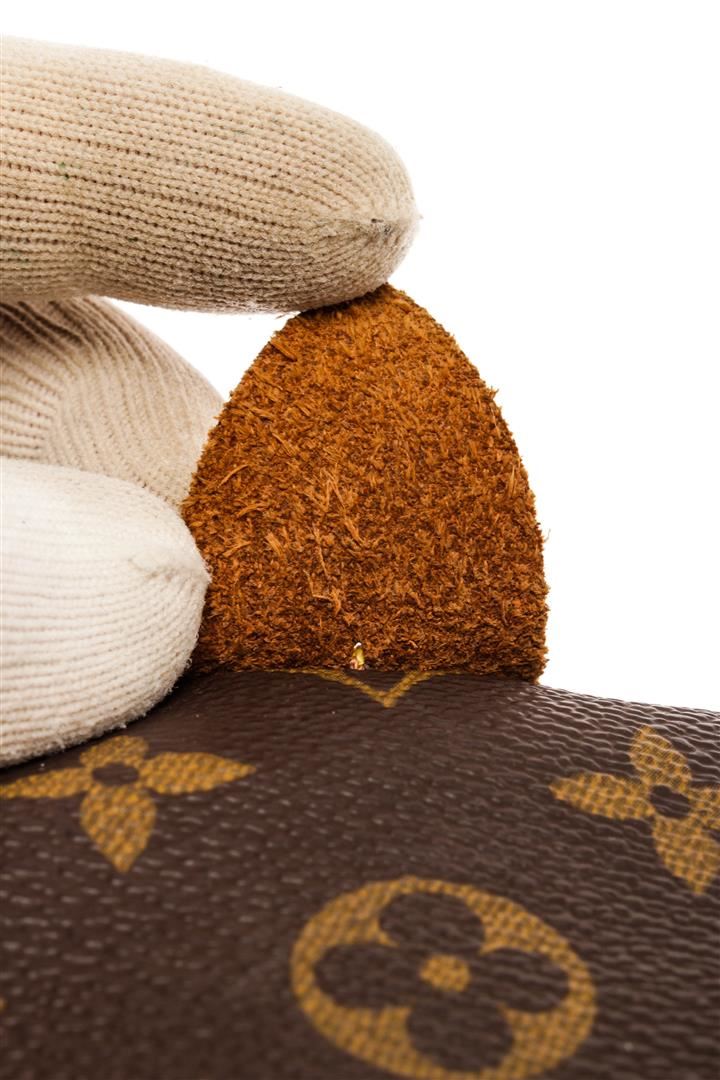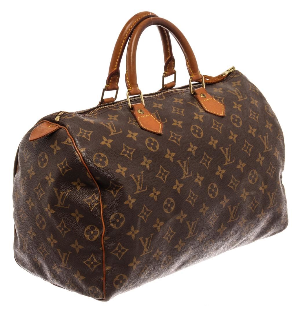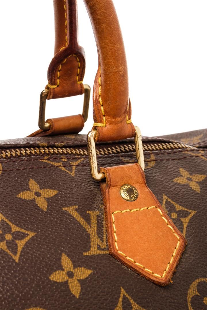Louis Vuitton Brown Monogram Canvas Speedy 35 Satchel Bag. All available information is listed in the description and shown in the photos. Louis Vuitton Brown Monogram Canvas Speedy 35 Satchel Bag with brass hardware, dual rolled handles, leather trim embellishment, canvas lining & single interior pocket, zip closure at top. Height: 10.25" Width: 13.75" Depth: 7", Handle Drop: 3.75" / 26.03 x 34.92 x 17.78 Cm