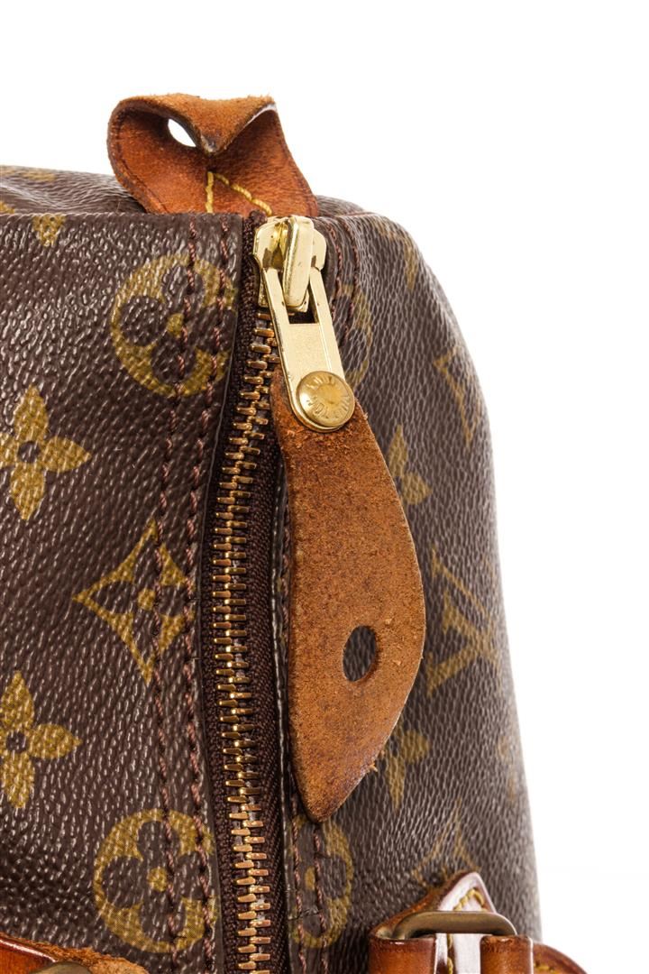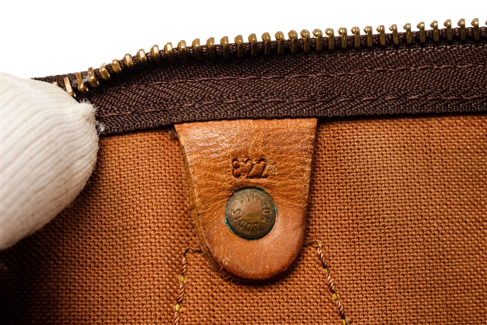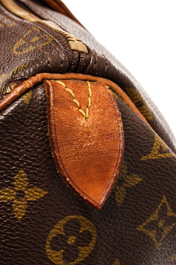 Louis Vuitton Brown Monogram Canvas Speedy 35 Satchel Bag. All available information is listed in the description and shown in the photos. Louis Vuitton Brown Monogram Canvas Speedy 35 Satchel Bag with brown coated canvas, brass hardware, dual rolled handles, leather trim embellishment, canvas lining & single interior pocket, zip closure at top. Height: 10.25" Width: 13.75" Depth: 7", Handle Drop: 3.75" / 26.03 x 34.92 x 17.78 Cm