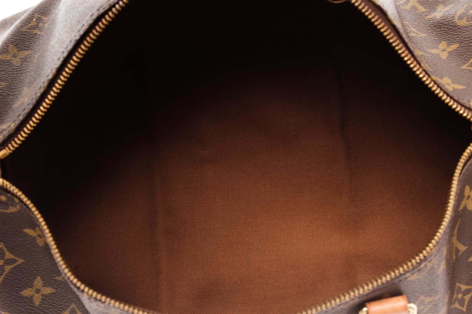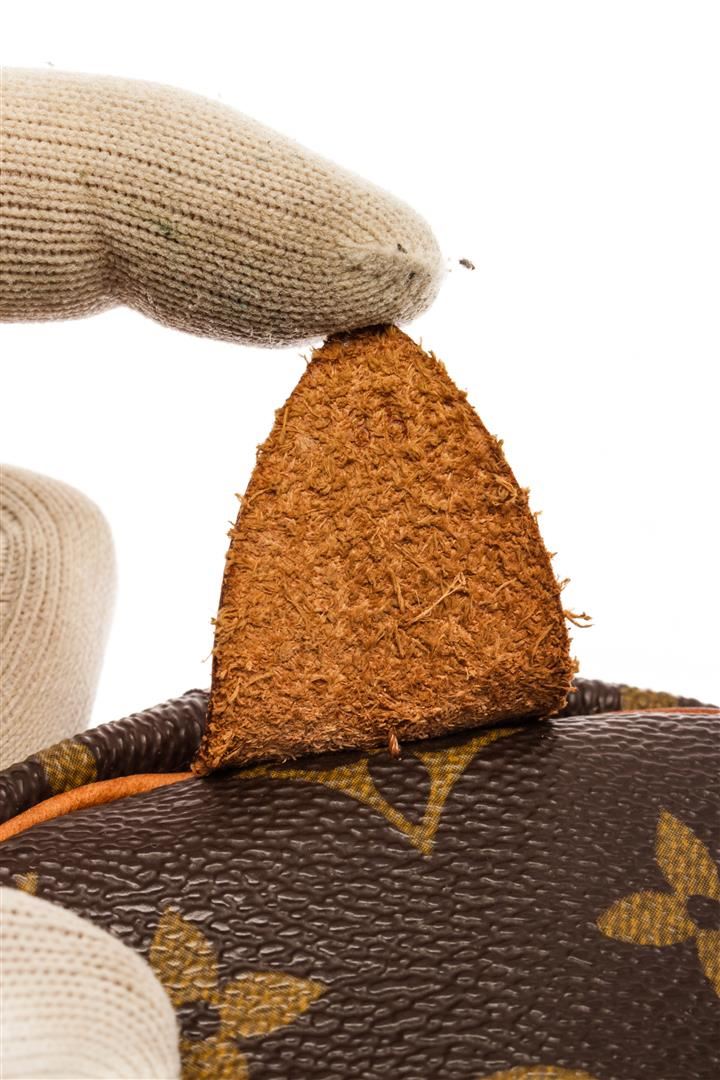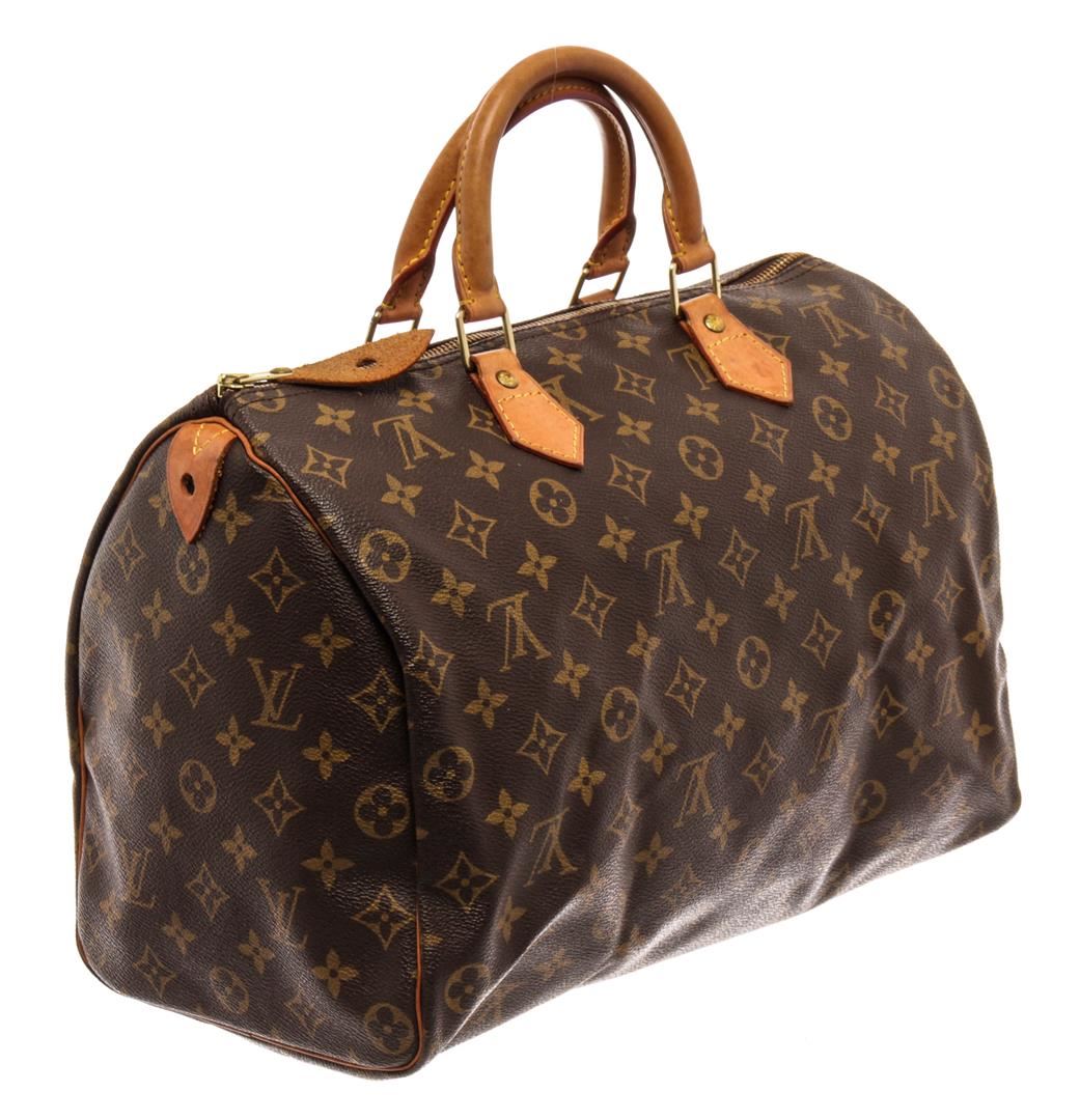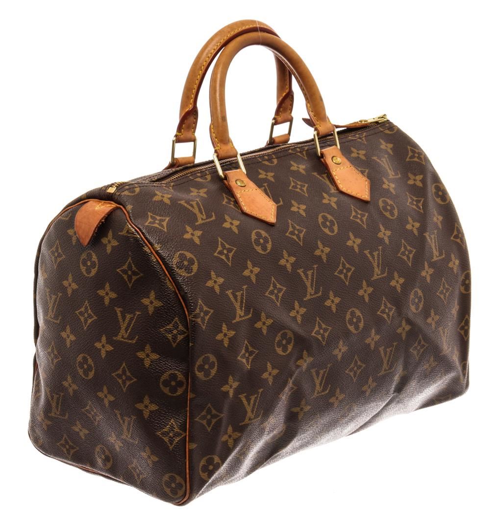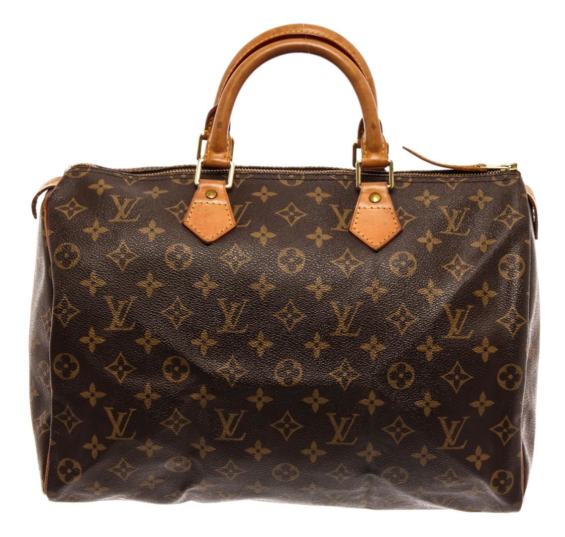 Louis Vuitton Brown Monogram Canvas Speedy 35 Satchel Bag. All available information is listed in the description and shown in the photos. Louis Vuitton Brown Monogram Canvas Speedy 35 Satchel Bag with brass hardware, leather trim, rolled handles, leather trim embellishment, canvas lining & single interior pocket, zip closure at top. Height: 9" Width: 14" Depth: 7.5", Handle Drop: 3.5" / 22.86 x 35.56 x 19.05 Cm