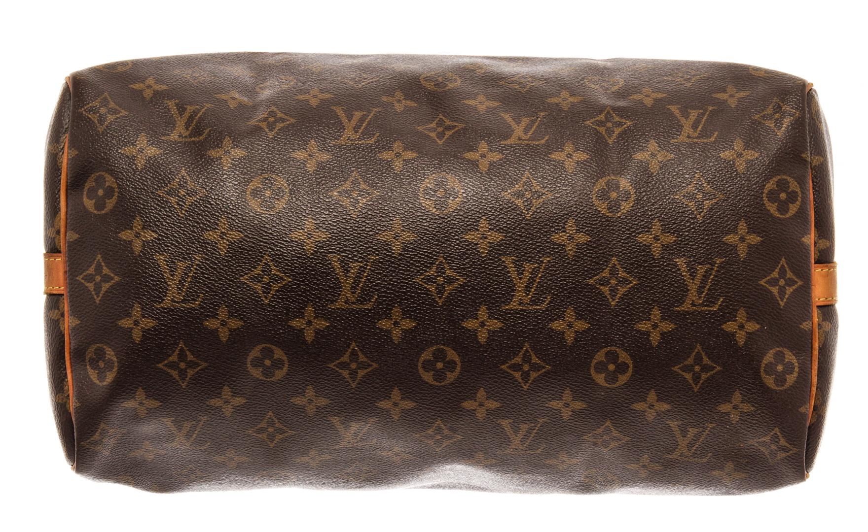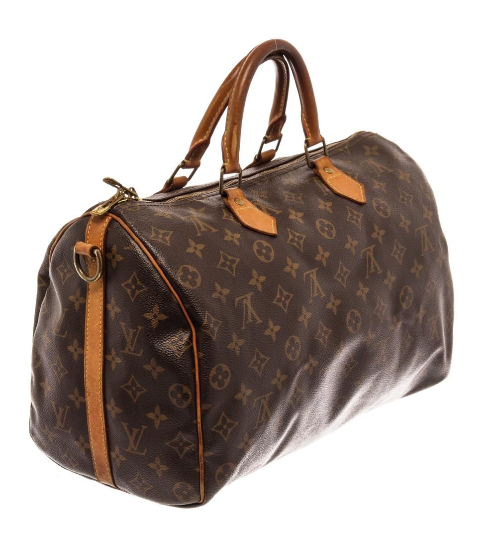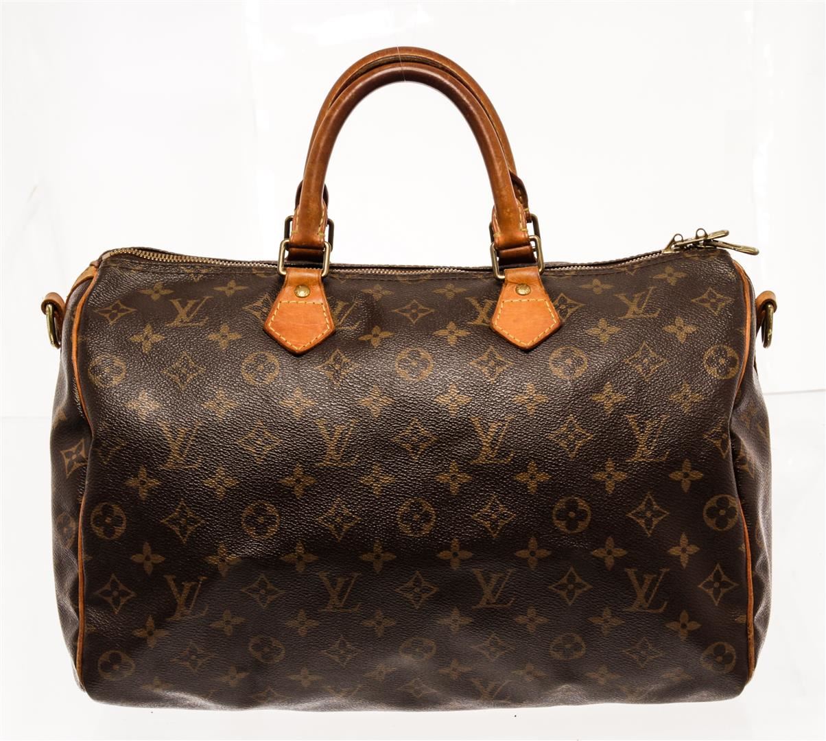Louis Vuitton Brown Monogram Canvas Speedy Bandouliere 35 Satchel Bag. All available information is listed in the description and shown in the photos. Louis Vuitton Brown Monogram Canvas Speedy Bandouliere 35 Satchel Bag with brass hardware, leather trim, dual rolled handles & single adjustable shoulder strap, leather trim embellishment, canvas lining & single interior pocket, zip closure at top. Height: 9.75" Width: 13.75" Depth: 7", Handle Drop: 3.5", Shoulder Strap Drop: 19.5" / 24.76 x 34.92 x 17.78 Cm