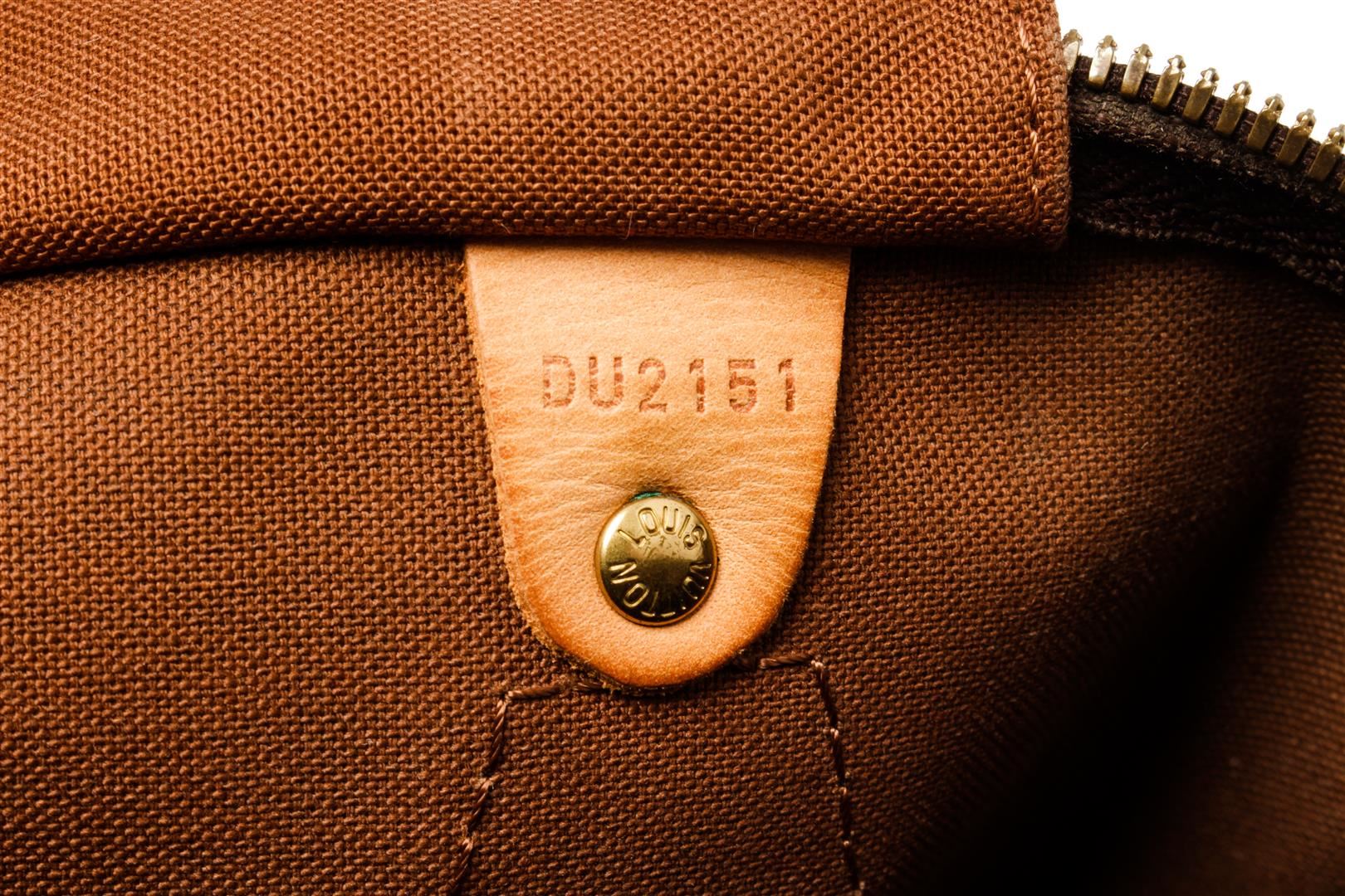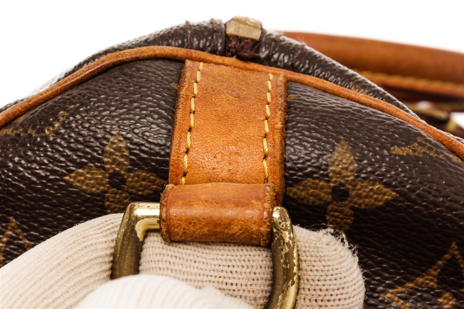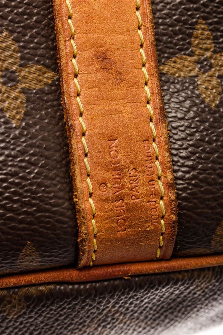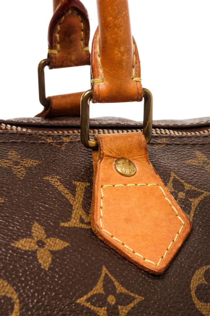 Louis Vuitton Brown Monogram Canvas Speedy Bandouliere 35 Satchel Bag. All available information is listed in the description and shown in the photos. Louis Vuitton Brown Monogram Canvas Speedy Bandouliere 35 Satchel Bag with brass hardware, leather trim, dual rolled handles & single adjustable shoulder strap, leather trim embellishment, canvas lining & single interior pocket, zip closure at top. Height: 9.75" Width: 13.75" Depth: 7", Handle Drop: 3.5", Shoulder Strap Drop: 19.5" / 24.76 x 34.92 x 17.78 Cm