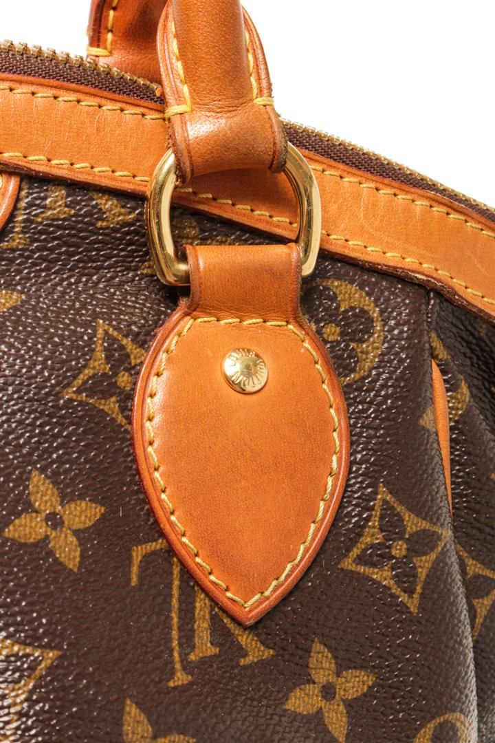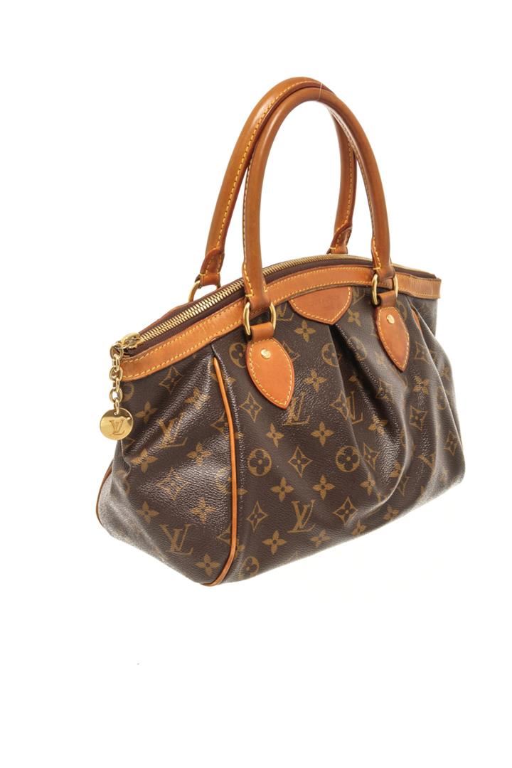 One Louis Vuitton Brown Monogram Canvas Tivoli PM Tote bag. Item is sold AS-IS. All available information is listed in the description and shown in the photo. Louis Vuitton Brown Monogram Canvas Tivoli PM Tote bag with gold-tone hardware, two leather handles, sturdy metal feet, canvas lining,