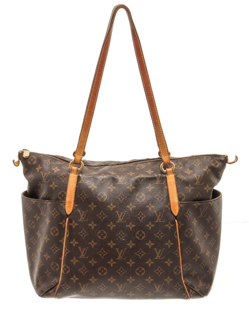 One Louis Vuitton Brown Monogram Canvas Totally GM Shoulder Bag. Item is sold AS-IS. All available information is listed in the description and shown in the photo. Louis Vuitton Brown Monogram Canvas Totally GM Shoulder Bag with brass hardware, tan vachetta leather trim, dual flat shoulder straps, dual exterior slit pockets at sides, brown woven interior lining, three interior slit pockets, zip closure at top. There are some stains on the lining. Please refer to photos. L 18" x H 13.5" x W 6.5" / 45.72 x 34.29 x 16.51 cm
