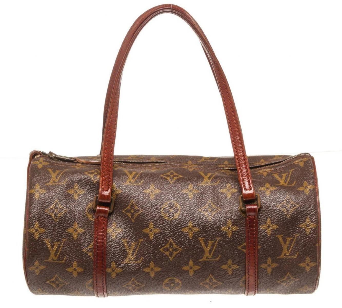 Louis Vuitton Brown Monogram Canvas Vintage Papillon Shoulder Bag with gold-tone hardware, brown vintage leather trim, dual top handles, brown leather interior lining, and zipper closure at top.