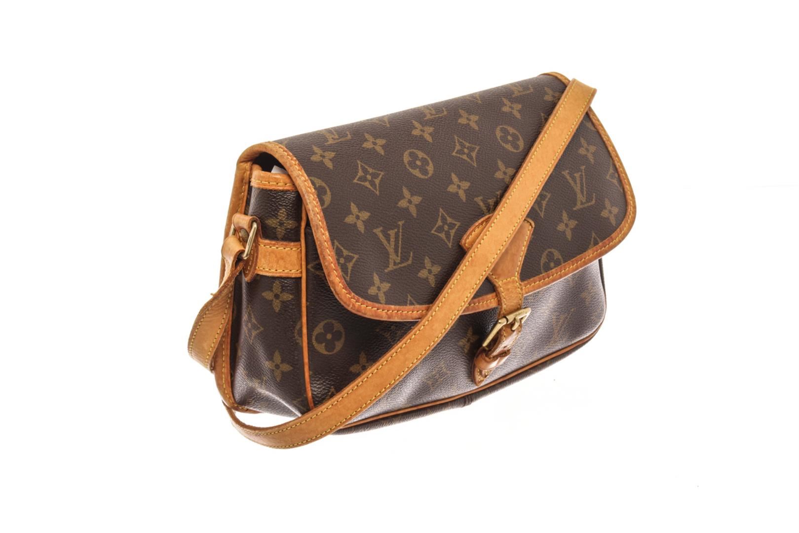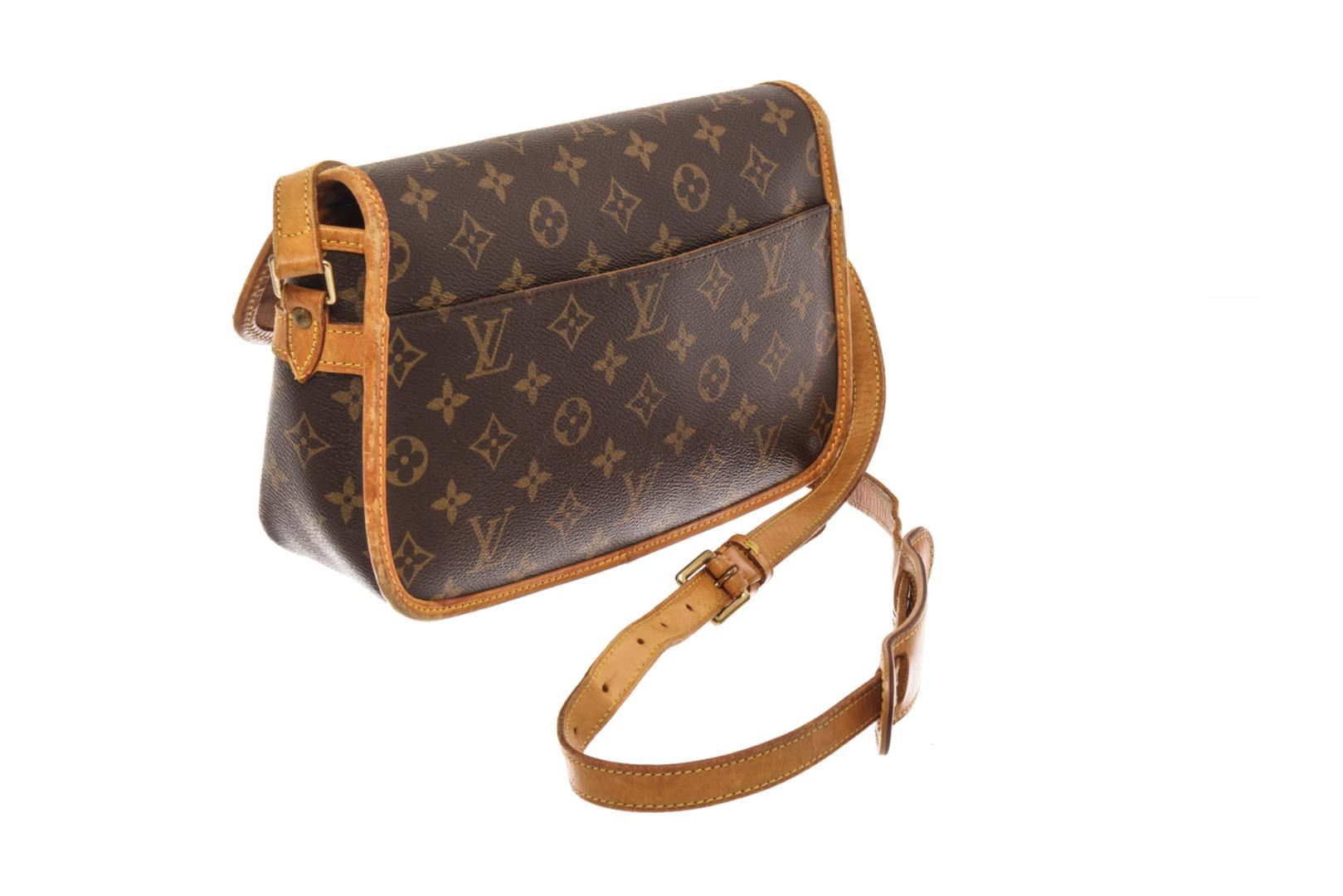 Louis Vuitton Brown Monogram Coated Canvas Sologne Bag. All available information is listed in the description and shown in the photos. Louis Vuitton Brown Monogram Coated Canvas Sologne Bag with brass hardware, tan vachetta leather trim, adjustable flat shoulder strap featuring shoulder pad, exterior slip pocket at back, single pocket at flap underside, brown canvas lining, single zip pocket at interior wall and buckle closure at front flap. Depth 3.1 in, Width 10.2 in/ Depth 8 cm, Width 26 cm