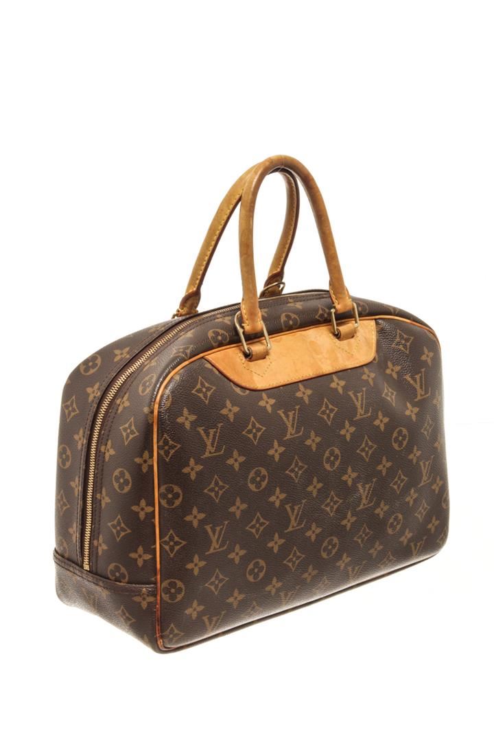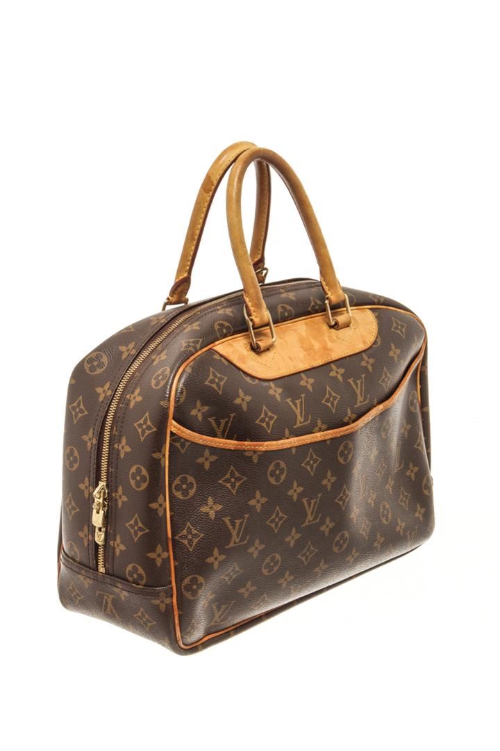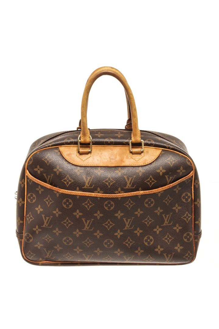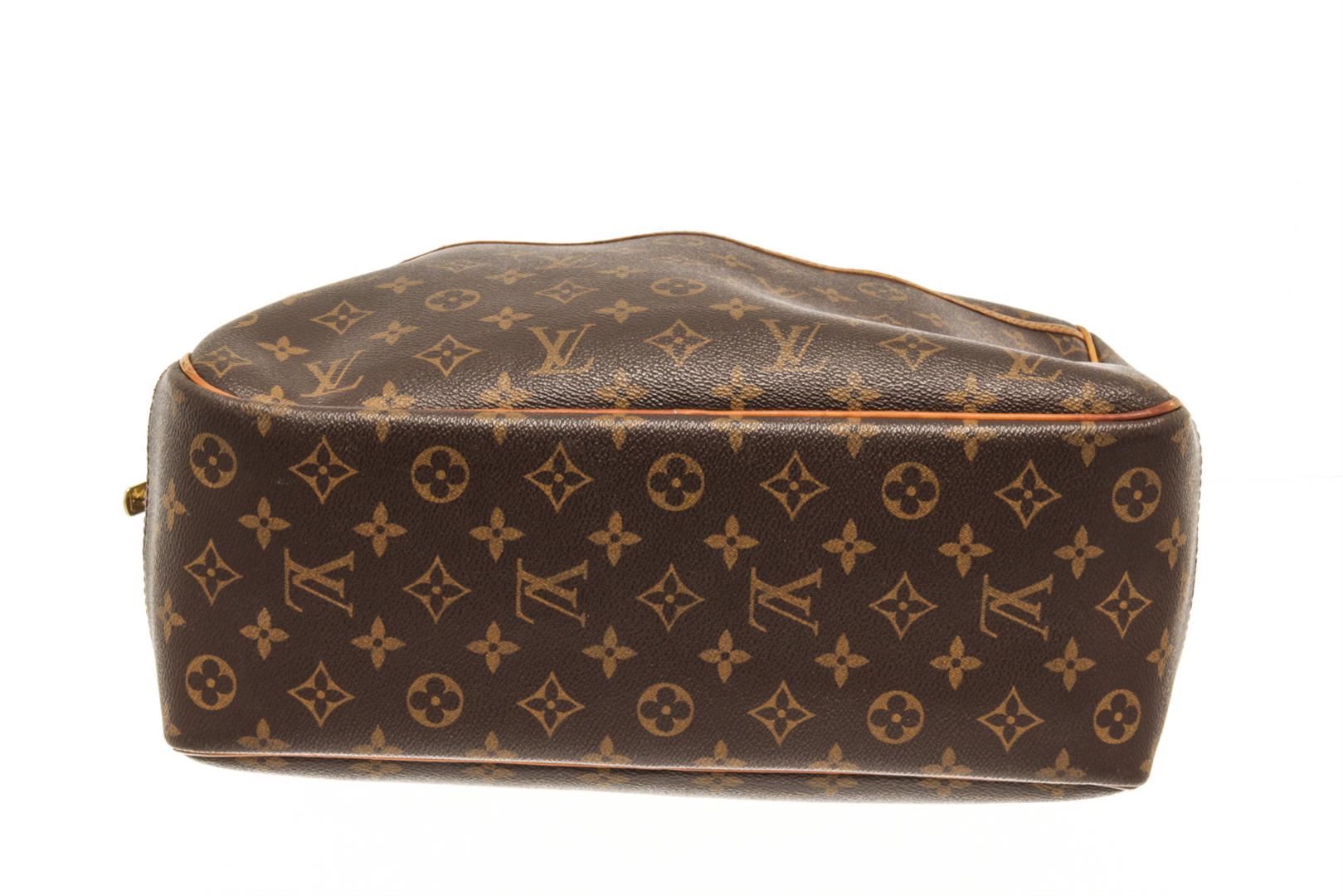 One Louis Vuitton Brown Monogram Deauville Bag. Item is sold AS-IS. All available information is listed in the description and shown in the photo. Louis Vuitton Brown Monogram Deauville Bag with top handle, exterior pocket, two interior slip pockets, canvas lining, gold tone hardware, zipper closure. There are some stains on the canvas lining and wear on the vachetta. Please refer to photos. Height: 9.1" Width: 13" Depth: 4.7", Handle Drop: 3.5" / 23.11 x 33.02 x 11.93 Cm
