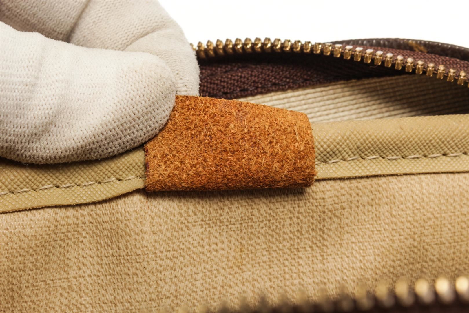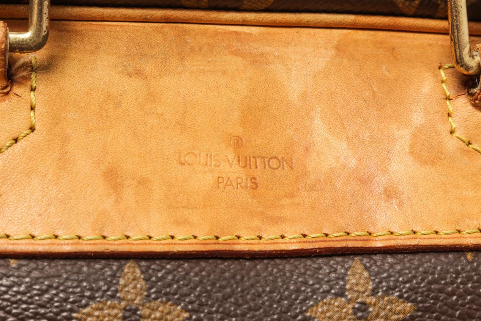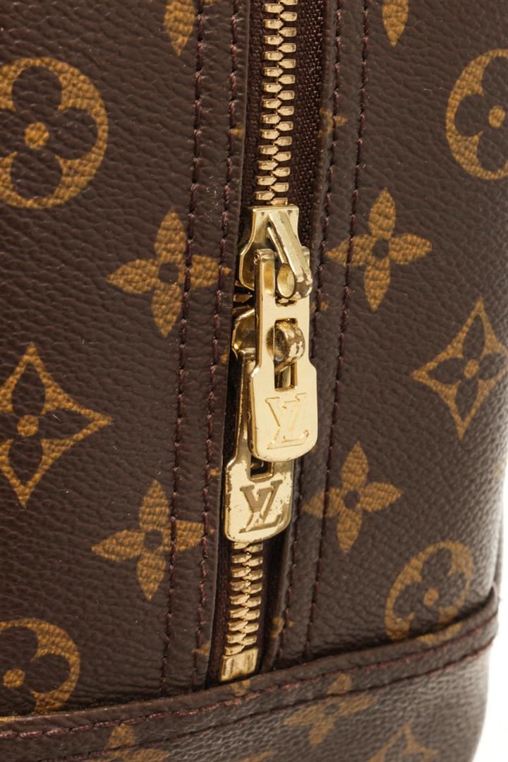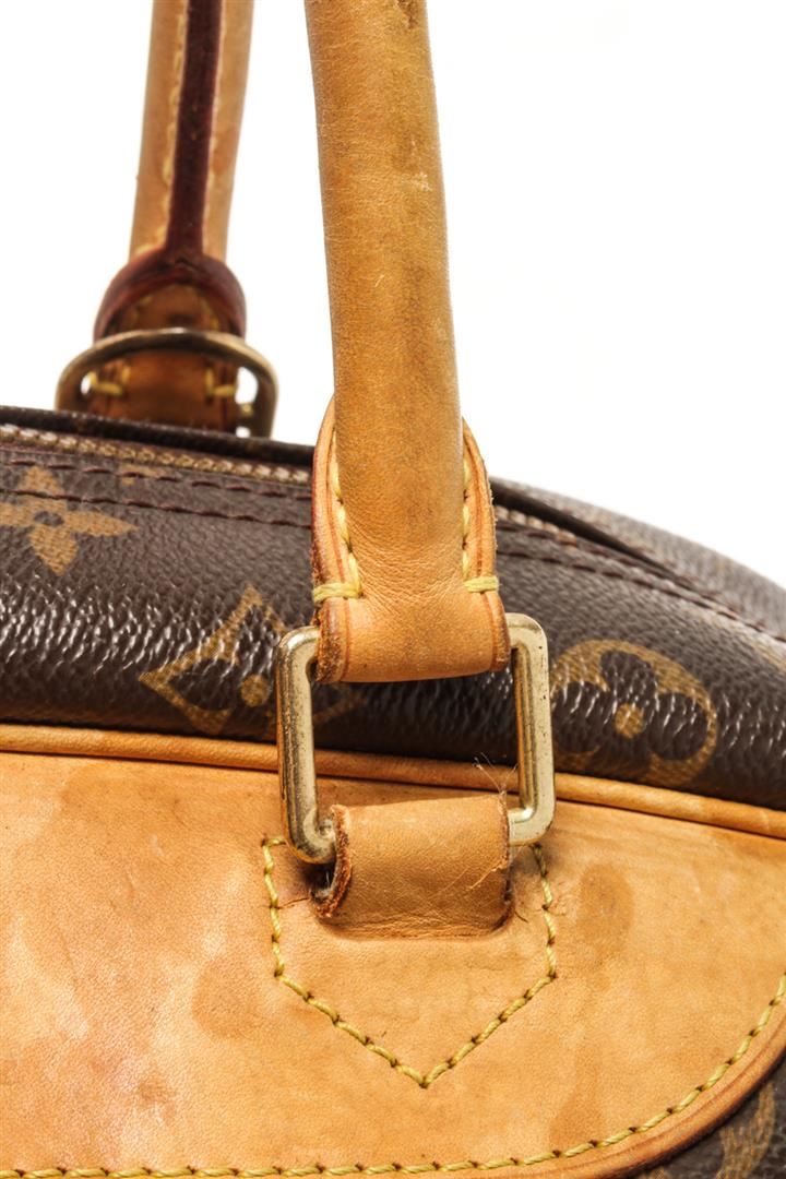 One Louis Vuitton Brown Monogram Deauville Bag. Item is sold AS-IS. All available information is listed in the description and shown in the photo. Louis Vuitton Brown Monogram Deauville Bag with top handle, exterior pocket, two interior slip pockets, canvas lining, gold tone hardware, zipper closure. There are some stains on the canvas lining and wear on the vachetta. Please refer to photos. Height: 9.1" Width: 13" Depth: 4.7", Handle Drop: 3.5" / 23.11 x 33.02 x 11.93 Cm