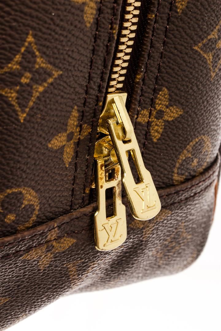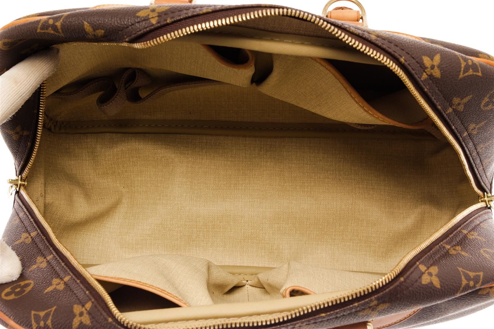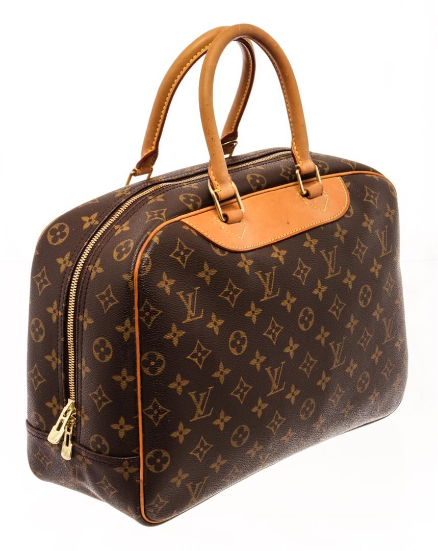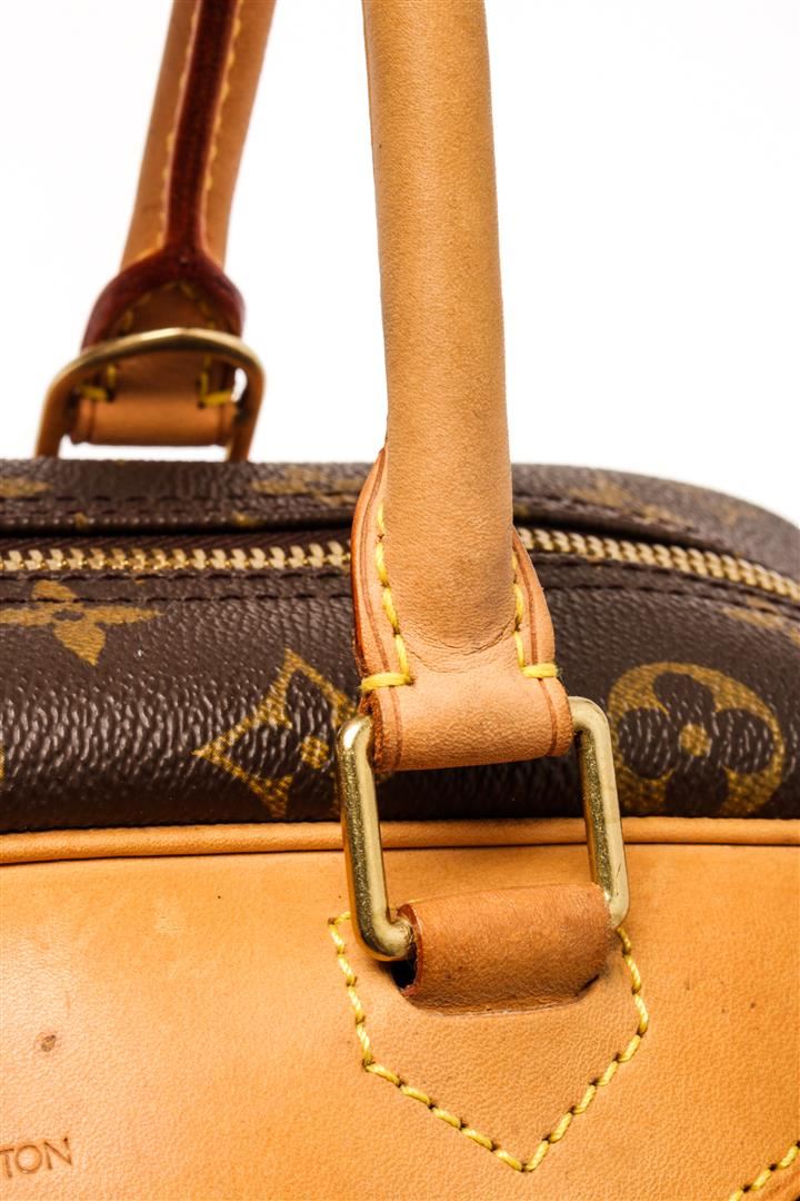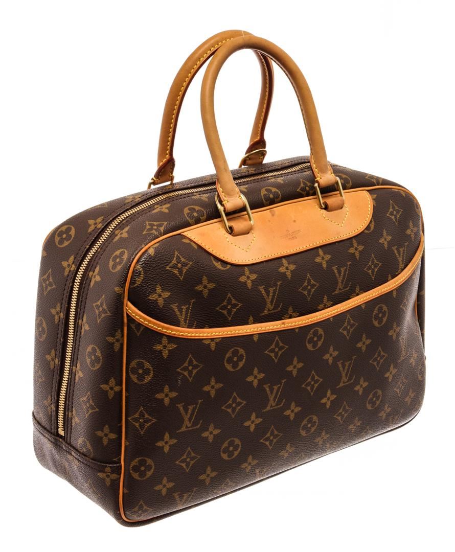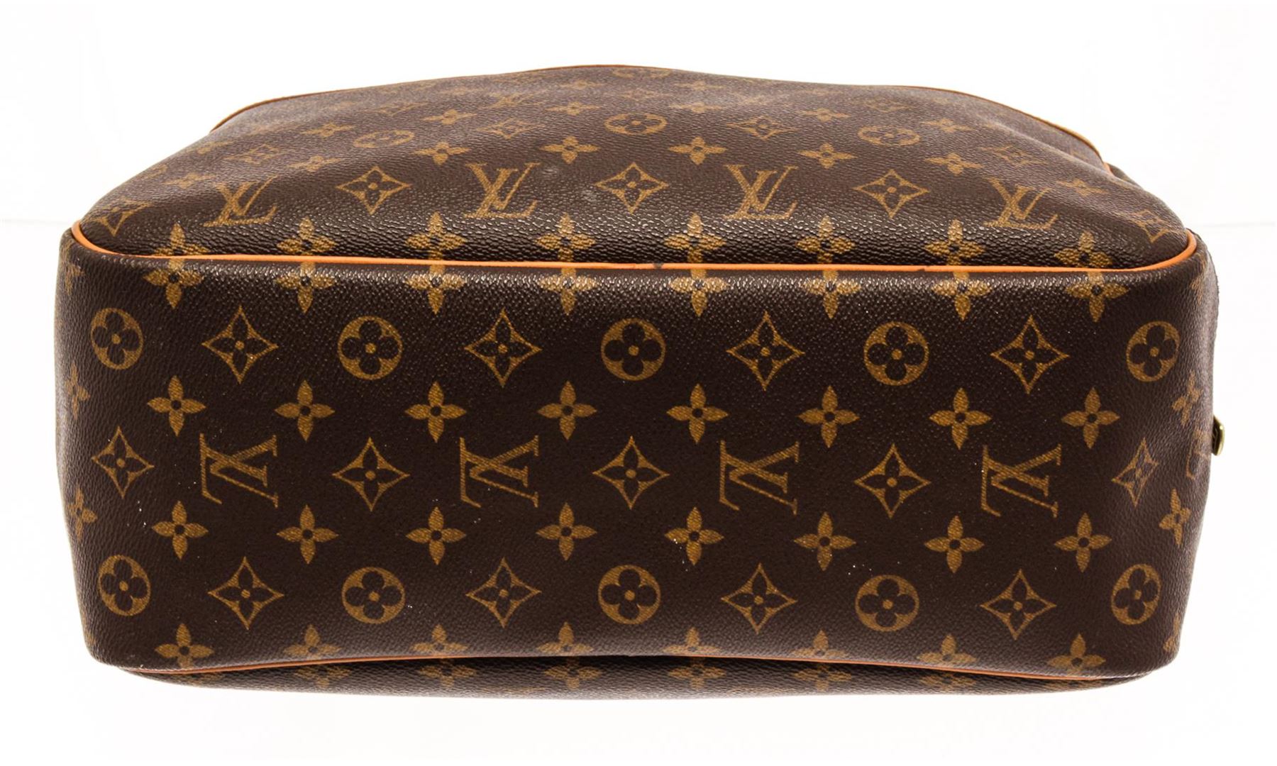 Louis Vuitton Brown Monogram Deauville Shoulder Bag. All available information is listed in the description and shown in the photos. Louis Vuitton Brown Monogram Monogram Deauville Shoulder Bag with brown, printed, antiqued gold-tone hardware, suede lining & single interior pocket, zip closure at top. Height: 11" Width: 13" Depth: 5" Handle Drop: 7"