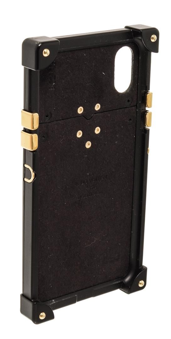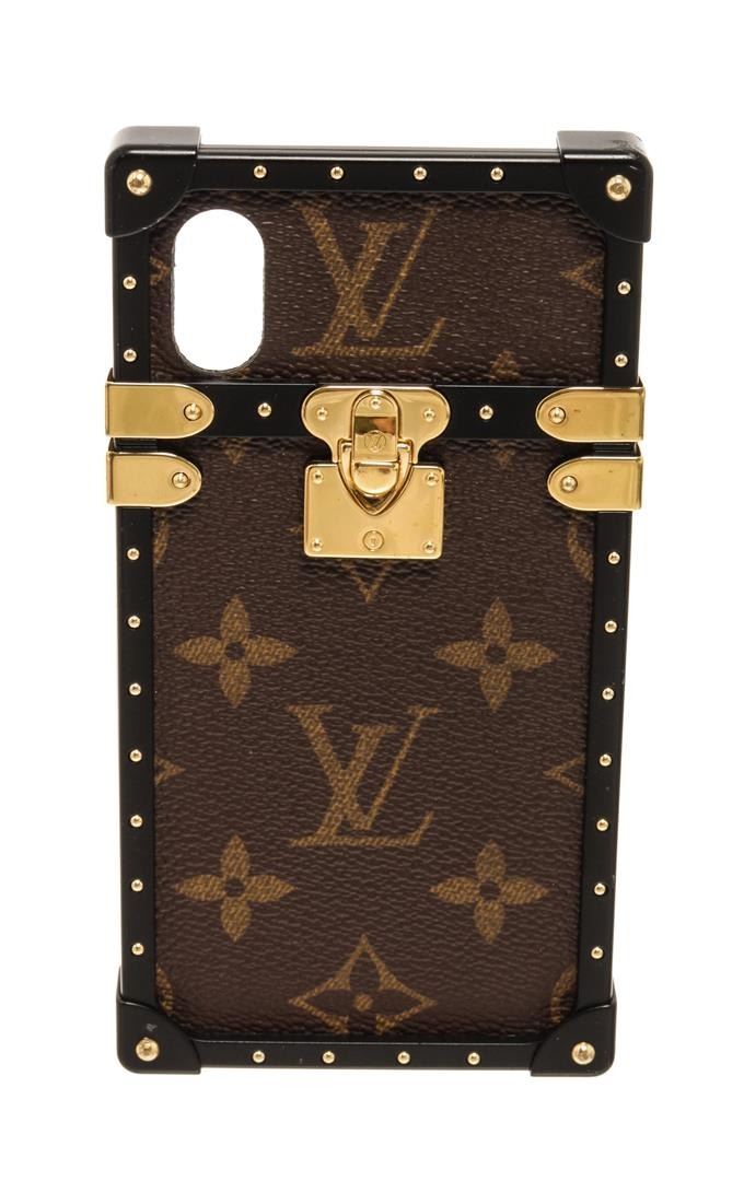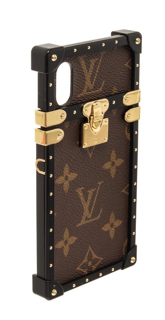 One Louis Vuitton Brown Monogram Eye-Trunk iPhone X Case. Item is sold AS-IS. All available information is listed in the description and shown in the photo. Louis Vuitton Monogram Eye-Trunk iPhone X Case with louis vuitton case has been crafted from monogram canvas and styled to resemble their famous trunk designs. the creation has gold-tone metal accents and suede-lined insides. Height: 5.91 in (15 cm) Width: 0.4 in (1 cm) Length: 3.15 in (8 cm)