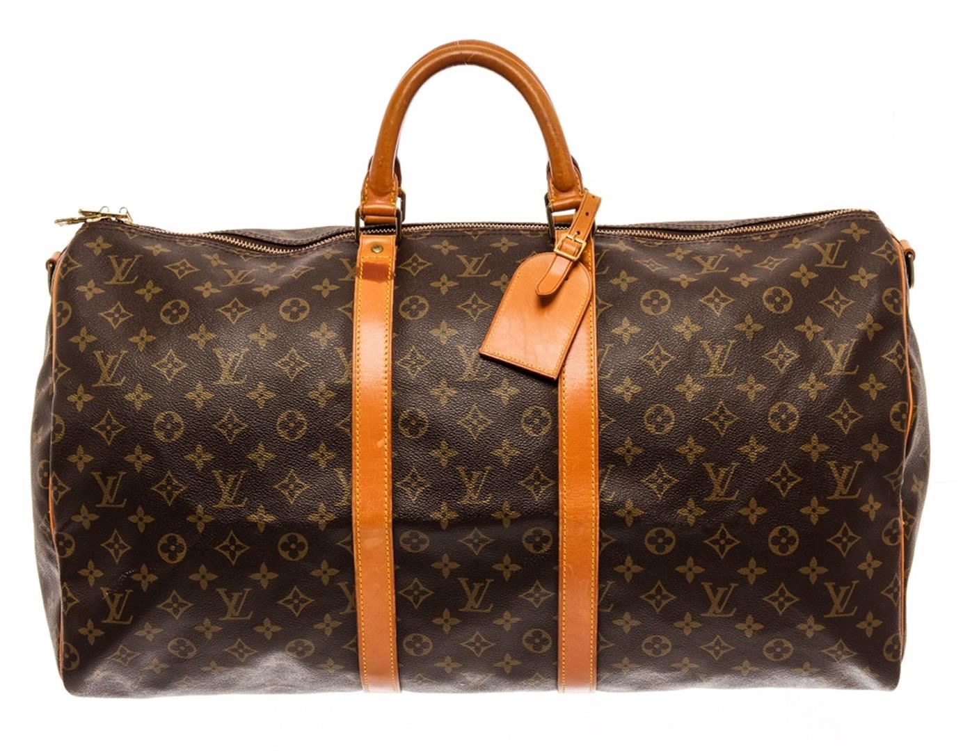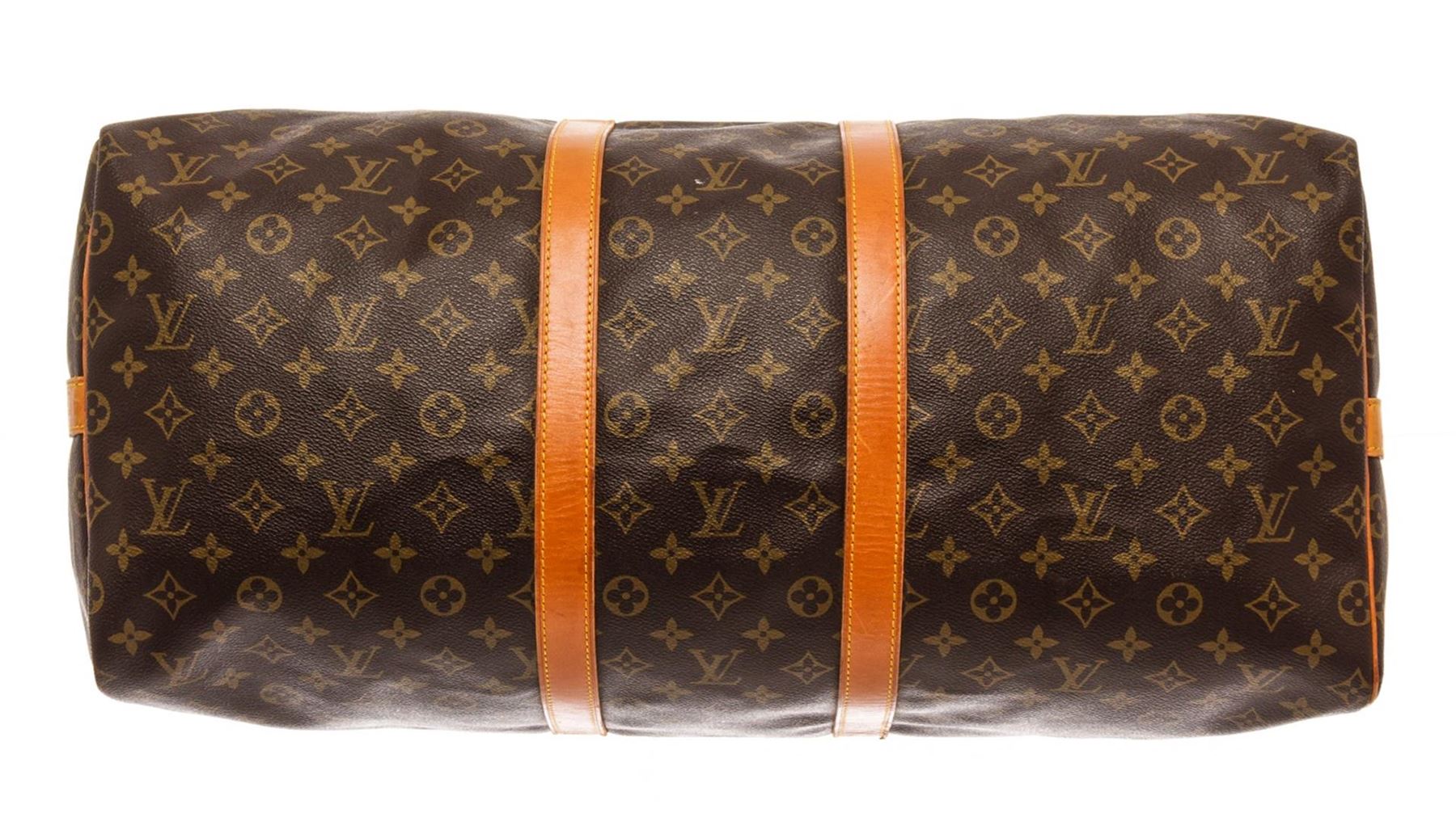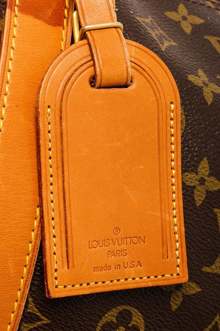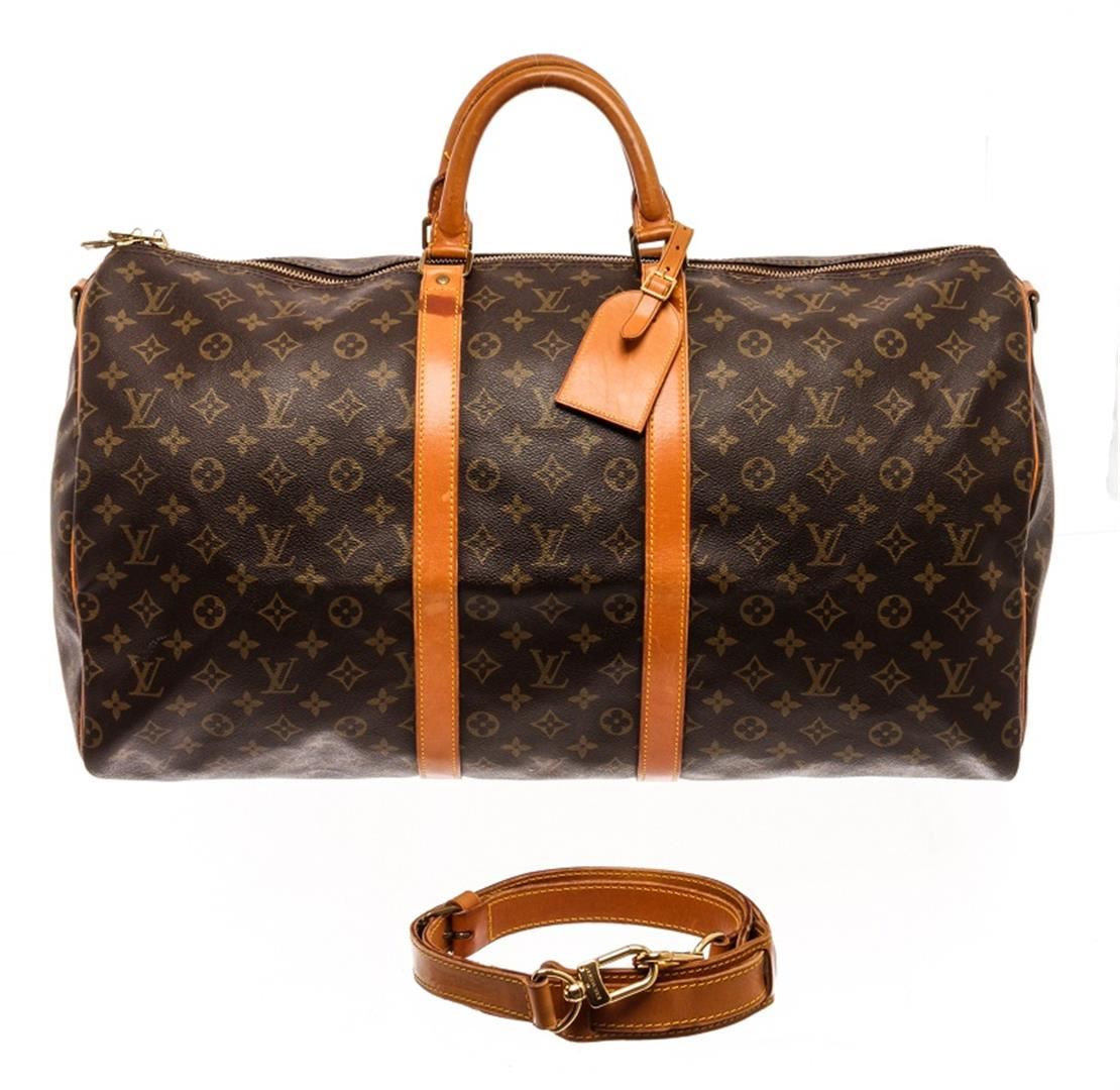 Louis Vuitton Brown Monogram Keepall Bandouliere 50 Travel Bag. All available information is listed in the description and shown in the photos. Louis Vuitton Brown Monogram Keepall Bandouliere 50 Travel Bag with the features a monogram canvas body, rolled vachetta leather handles, brass hardware, leather trim, canvas lining, a detachable and adjustable flat shoulder strap, and a top zip closure. 11" L x 19.7" W x 7.9" D, Drop: 3.9", / 27.94 x 50.03 x 20.06 Cm