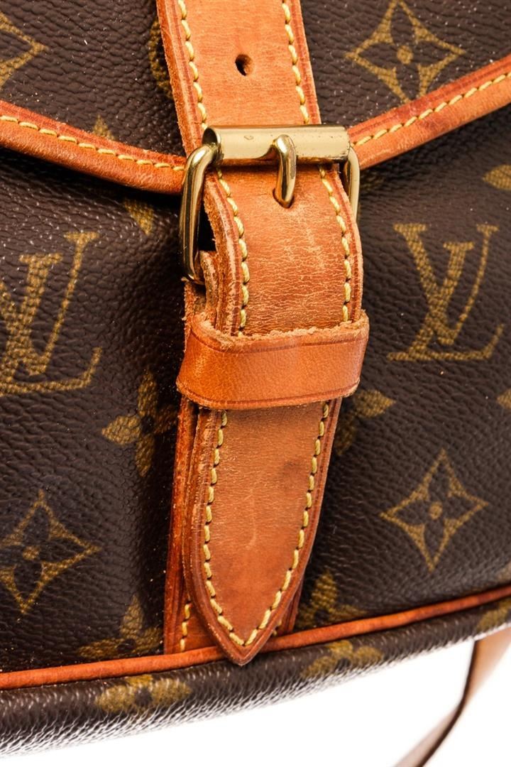 Louis Vuitton Brown Monogram Leather Saumur 35 Shoulder Bag. All available information is listed in the description and shown in the photos. Louis Vuitton Brown Monogram Leather Saumur 35 Shoulder Bag with brass hardware, leather trim, single adjustable shoulder strap, canvas lining & three interior pockets, buckle closure at front. Height: 10" Width: 11.5" Depth: 2", Shoulder Strap Drop: 18.5-23" / 25.4 x 29.21 x 5.08 Cm