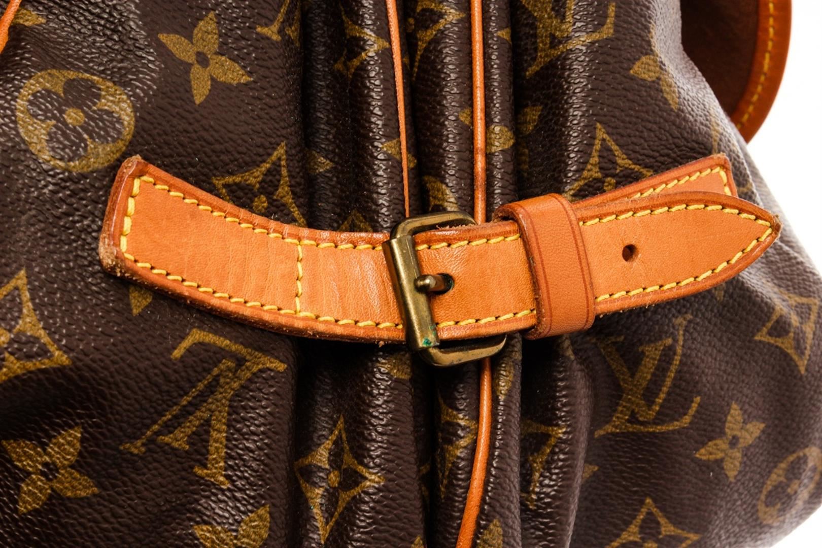 Louis Vuitton Brown Monogram Leather Saumur 35cm Shoulder Bag. All available information is listed in the description and shown in the photos. Louis Vuitton Brown Monogram Leather Saumur 35cm Shoulder Bag with vintage, brass hardware, leather trim, single adjustable shoulder strap, leather trim embellishment, canvas lining & three interior pockets, buckle closures at front & back. Height: 12" Width: 12.5" Depth: 5.75", Shoulder Strap Drop: 16" / 30.48 x 31.75 x 14.60 Cm