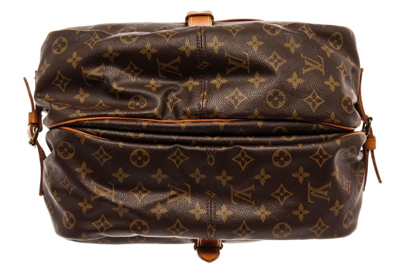 Louis Vuitton Brown Monogram Leather Saumur 35cm Shoulder Bag. All available information is listed in the description and shown in the photos. Louis Vuitton Brown Monogram Leather Saumur 35cm Shoulder Bag with vintage, brass hardware, leather trim, single adjustable shoulder strap, leather trim embellishment, canvas lining & three interior pockets, buckle closures at front & back. Height: 12" Width: 12.5" Depth: 5.75", Shoulder Strap Drop: 16" / 30.48 x 31.75 x 14.60 Cm