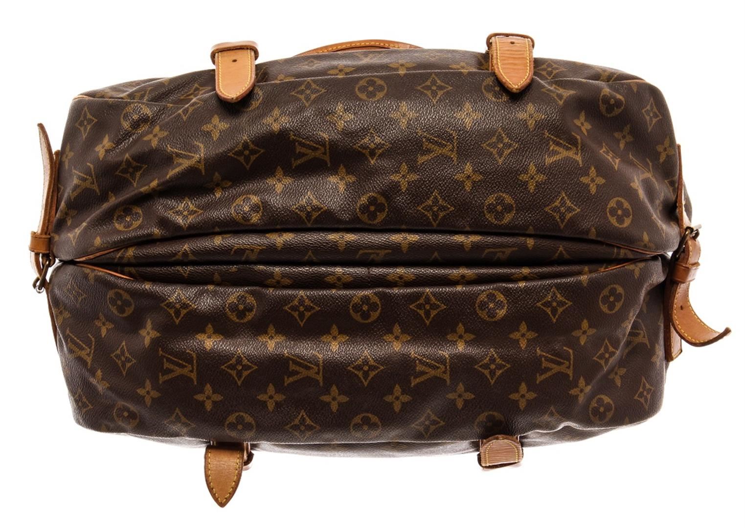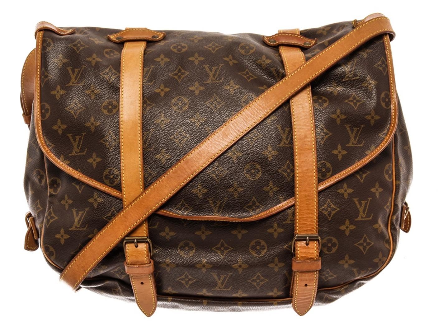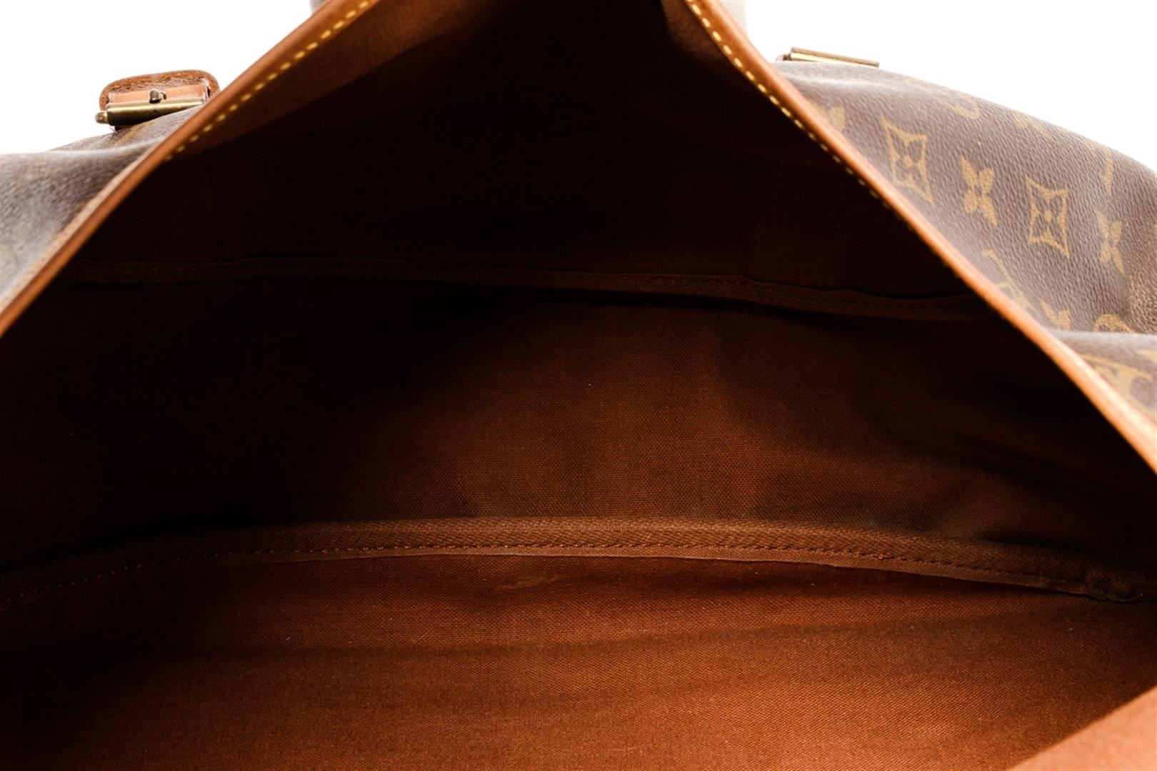 Louis Vuitton Brown Monogram Leather Saumur 43cm Shoulder Bag. All available information is listed in the description and shown in the photos. Louis Vuitton Brown Monogram Leather Saumur 43cm Shoulder Bag with vintage, brown coated canvas, brass hardware, single adjustable shoulder strap, leather trim embellishment, canvas lining & three interior pockets, buckle closure at front, includes dust bag. Height: 13.75" Width: 17" Depth: 8.25", Shoulder Strap Drop Max: 19.5" / 34.92 x 43.18 x 20.95 Cm