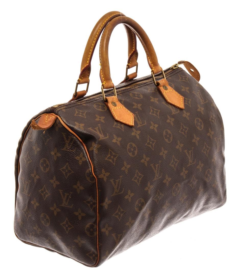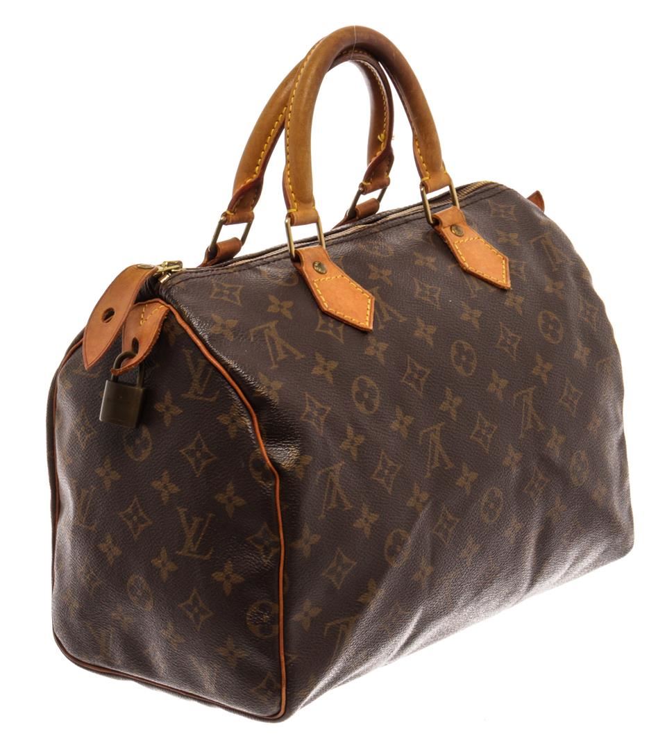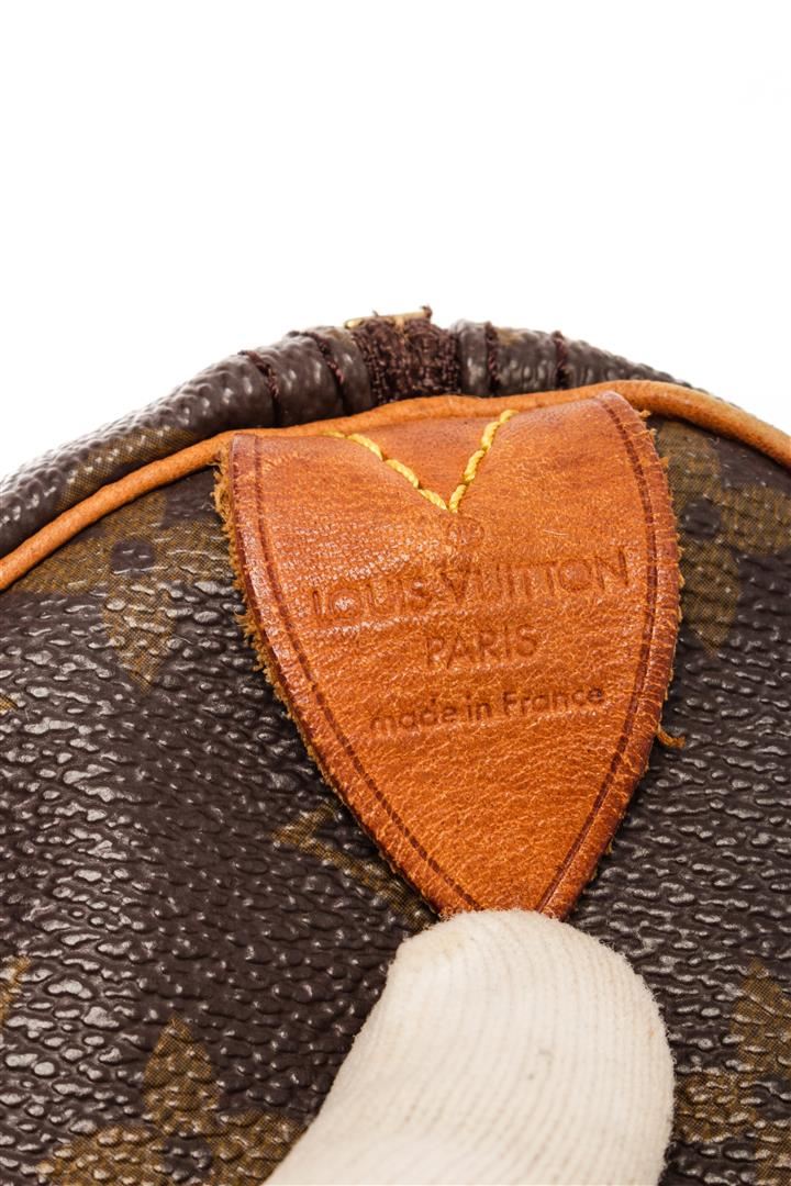 Louis Vuitton Brown Monogram Leather Speedy 30 Satchel Bag. All available information is listed in the description and shown in the photos. Louis Vuitton Brown Monogram Leather Speedy 30 Satchel Bag with brown & neutrals, brass hardware, leather trim, rolled handles, leather trim embellishment, grosgrain lining & single interior pocket, zip closure at top. Height: 8.25" Width: 11.75" Depth: 6.75", Handle Drop: 3" / 20.95 x 29.84 x 17.14 Cm