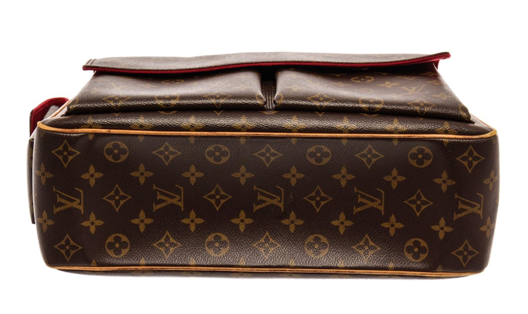 Louis Vuitton Brown Monogram Leather Viva Cite GM Top Handle Bag. All available information is listed in the description and shown in the photos. Louis Vuitton Brown Monogram Leather Viva Cite GM Top Handle Bag with brass hardware, dual shoulder straps, leather trim embellishment & three exterior pockets, alcantara lining & dual interior pockets, adjustable tan handles, zip closure at top. Height: 11" Width: 15.5" Depth: 4", Shoulder Strap Drop: 7.5" / 27.94 x 39.37 x 10.16 Cm