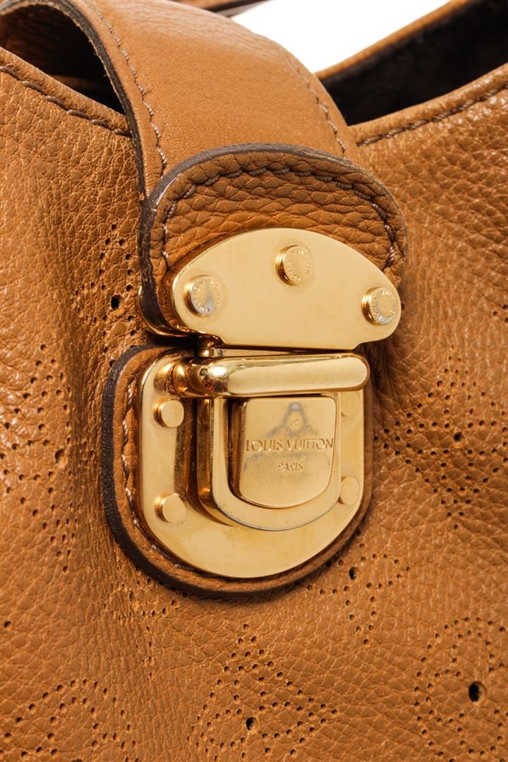 One Louis Vuitton Brown Monogram Mahina Leather Surya L Shoulder Bag. Item is sold AS-IS. All available information is listed in the description and shown in the photo. louis vuitton brown monogram mahina leather surya l shoulder bag with it features top handles and a flap with a push-lock closure that leads to an alcantara-lined interior. the bag is finished with protective metal feet and gold-tone hardware. Height: 10.24" Width: 5.91" Depth: 13.39", Handle Drop: / 26 x 15 x 34 Cm
