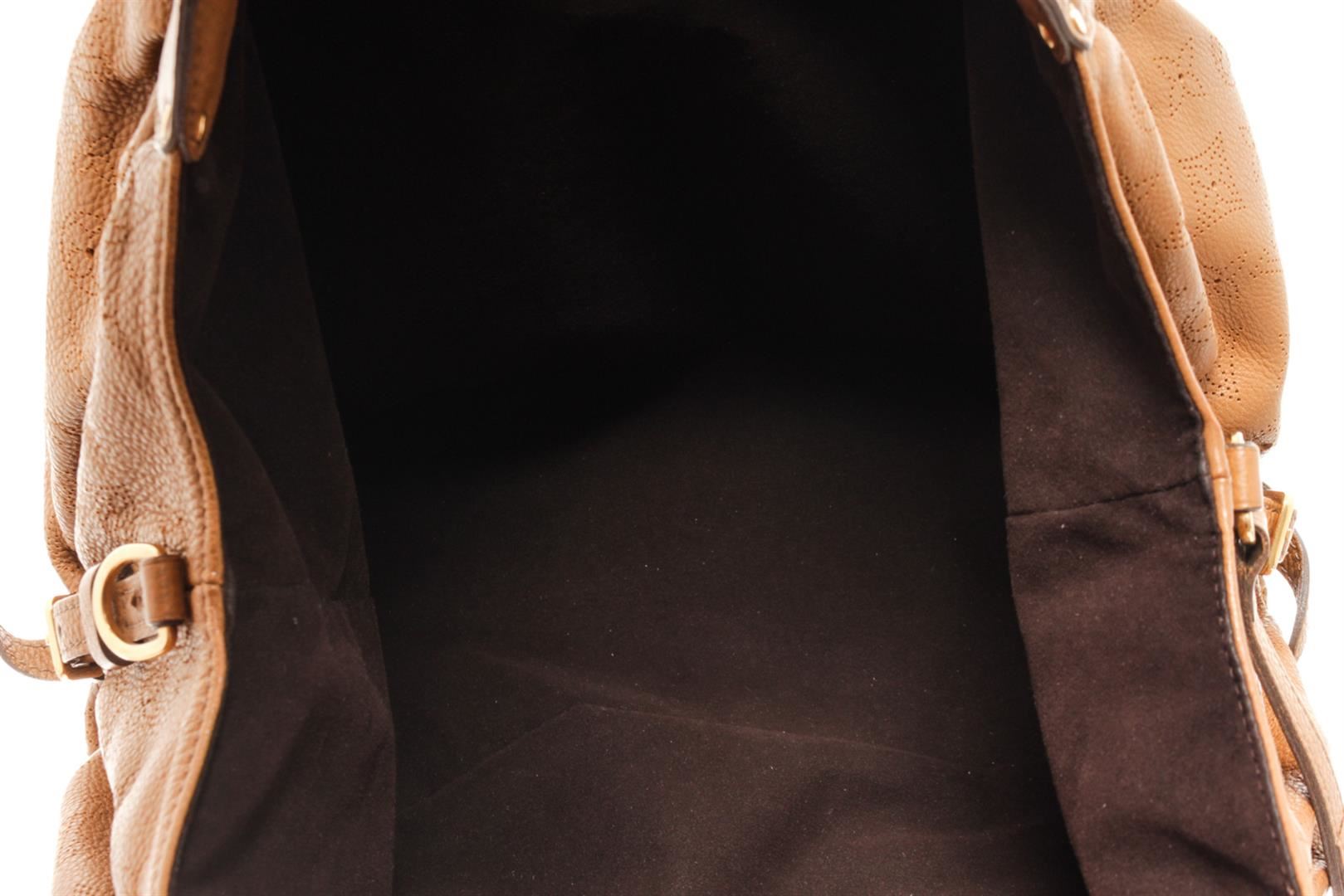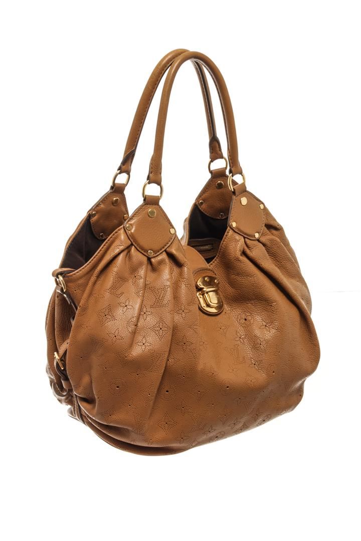 One Louis Vuitton Brown Monogram Mahina Leather Surya L Shoulder Bag. Item is sold AS-IS. All available information is listed in the description and shown in the photo. louis vuitton brown monogram mahina leather surya l shoulder bag with it features top handles and a flap with a push-lock closure that leads to an alcantara-lined interior. the bag is finished with protective metal feet and gold-tone hardware. Height: 10.24" Width: 5.91" Depth: 13.39", Handle Drop: / 26 x 15 x 34 Cm