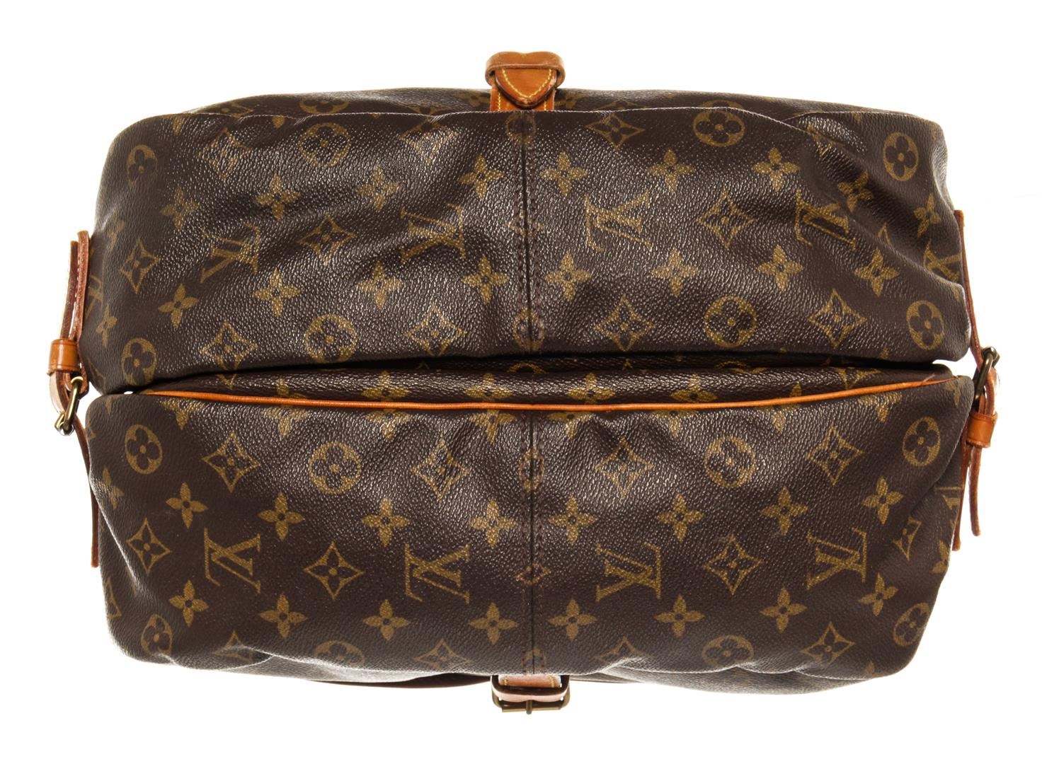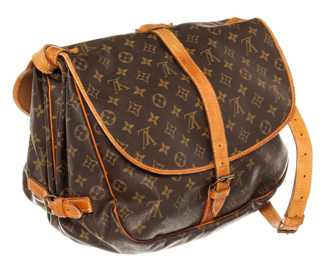 Louis Vuitton Brown Monogram Saumur 35cm Crossbody Bag. All available information is listed in the description and shown in the photos. Louis Vuitton Brown Monogram Saumur 35cm Crossbody Bag with gold-tone hardware, tan vachetta leather trim, interior zip pockets, canvas lining, leather shoulder strap, and flap closure.