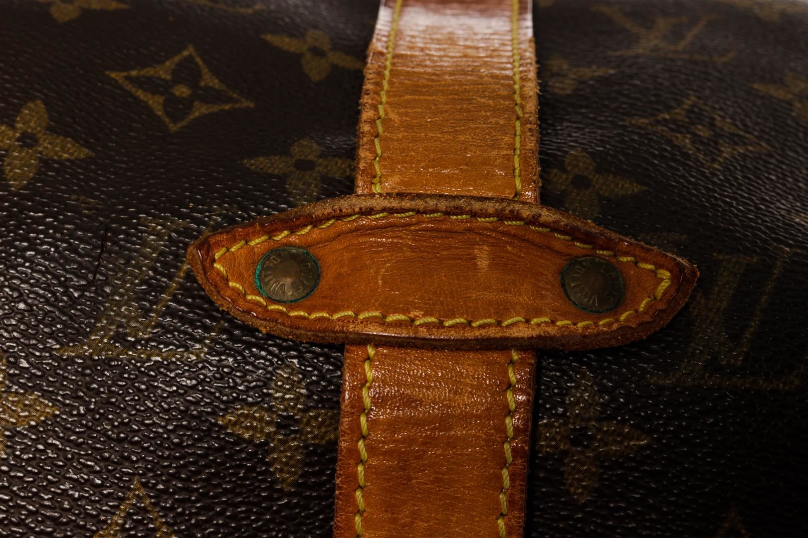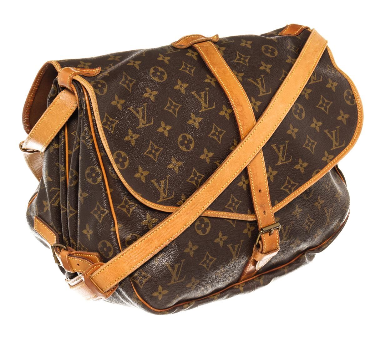 Louis Vuitton Brown Monogram Saumur 35cm Crossbody Bag. All available information is listed in the description and shown in the photos. Louis Vuitton Brown Monogram Saumur 35cm Crossbody Bag with gold-tone hardware, tan vachetta leather trim, interior zip pockets, canvas lining, leather shoulder strap, and flap closure.