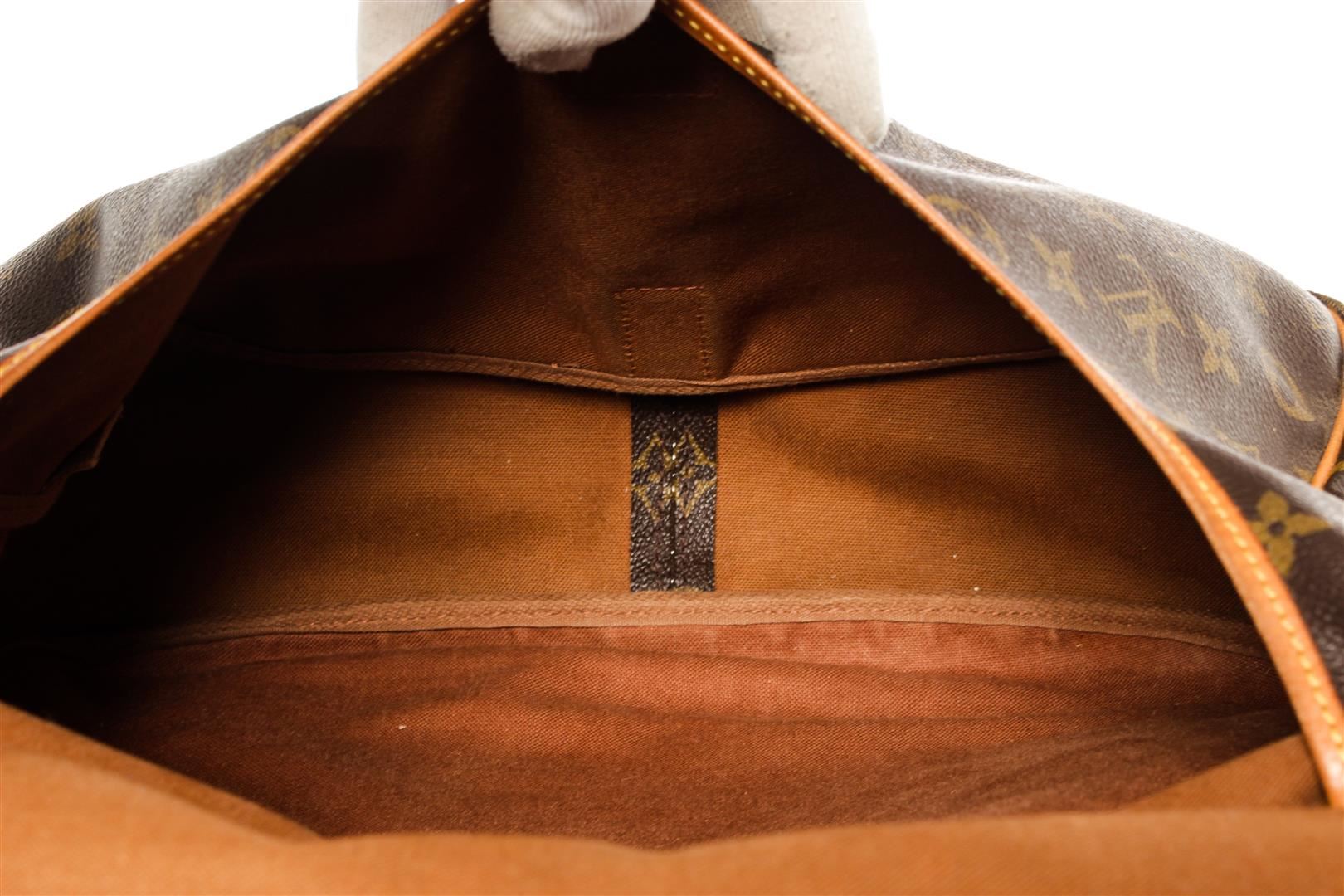 Louis Vuitton Brown Monogram Saumur 35cm Crossbody Bag. All available information is listed in the description and shown in the photos. Louis Vuitton Brown Monogram Saumur 35cm Crossbody Bag with gold-tone hardware, tan vachetta leather trim, interior zip pockets, canvas lining, leather shoulder strap, and flap closure.