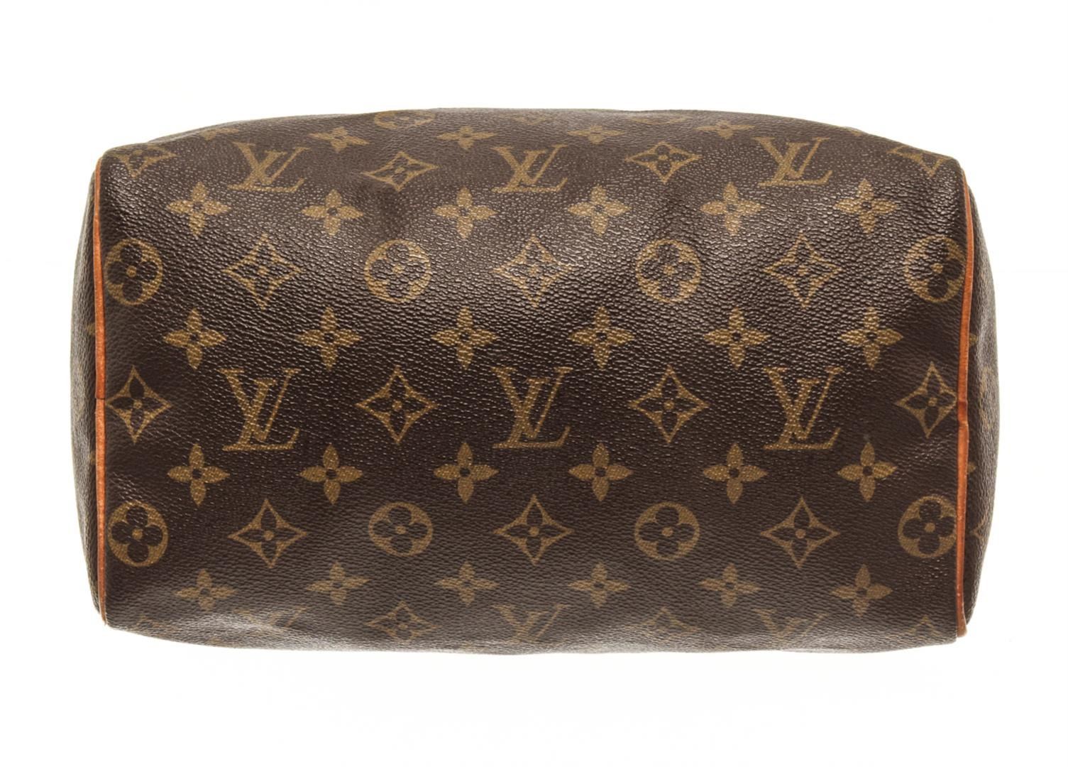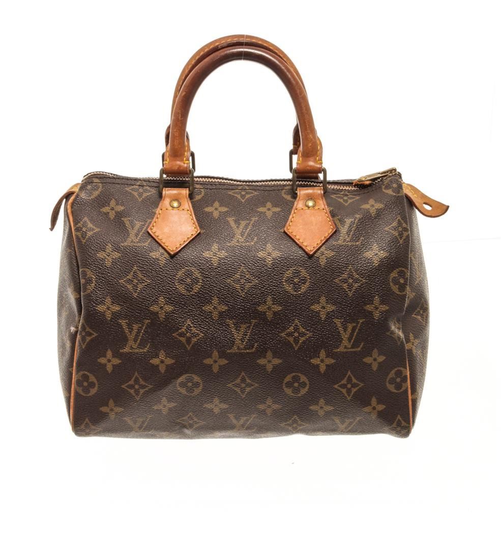 One Louis Vuitton Brown Monogram Speedy 25 Handbag. Item is sold AS-IS. All available information is listed in the description and shown in the photo. Louis Vuitton Brown Monogram Speedy 25 Handbag with brown monogram canvas, vachetta handles and trim, a top zip closure, and an interior pocket. 7.5" L x 9.8" W x 5.9" D, 3.5" drop / 19.05 L x 24.89 W x 14.98 D CM, 8.89 CM drop