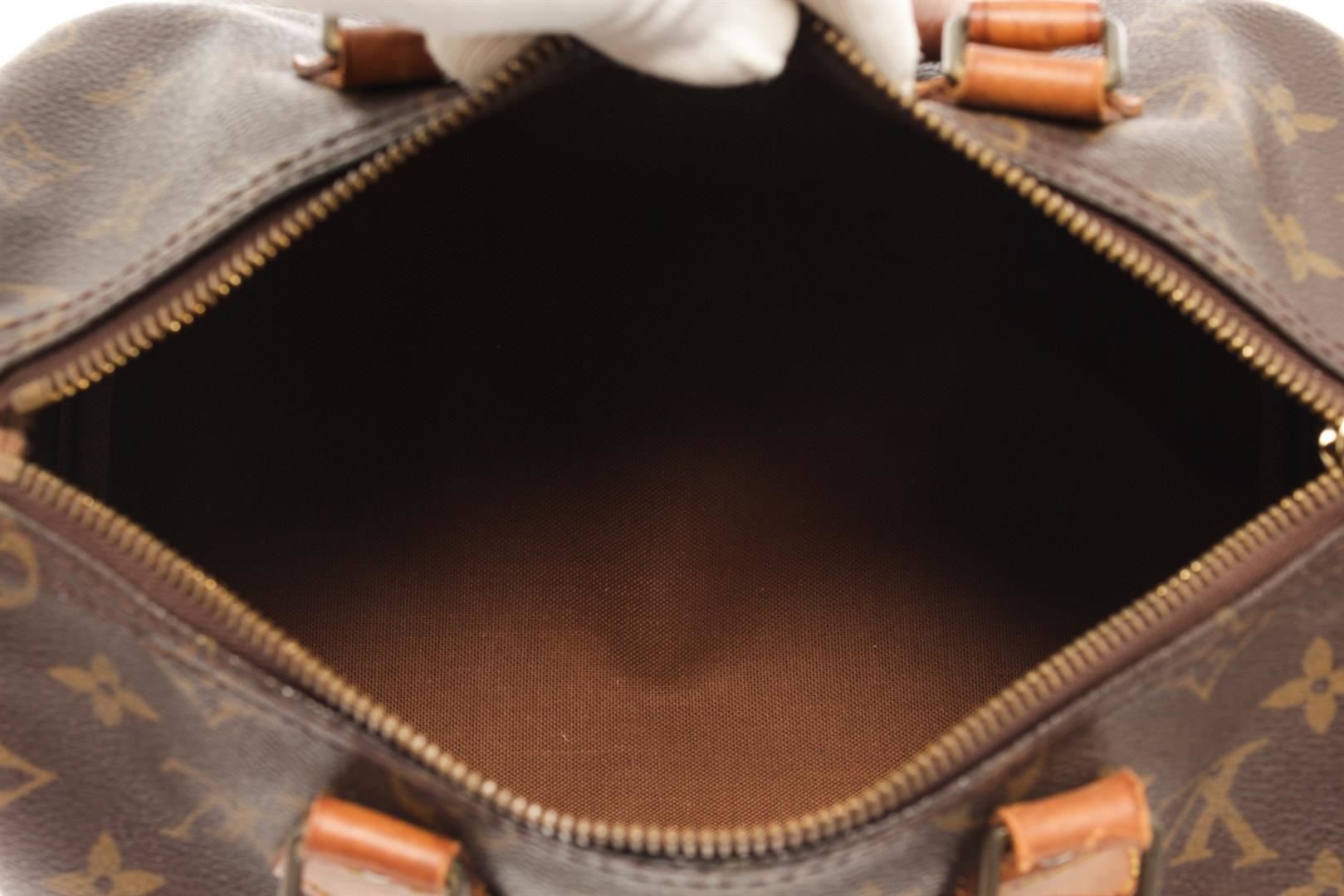 One Louis Vuitton Brown Monogram Speedy 25 Handbag. Item is sold AS-IS. All available information is listed in the description and shown in the photo. Louis Vuitton Brown Monogram Speedy 25 Handbag with brown and tan monogram coated canvas, brass hardware, tan vachetta leather trim, dual rolled top handles, brown interior canvas, single slit pocket at interior, zip closure on top. Height 7", Width 10", Depth 6", Handle Drop 3.25 Inch / 17.78 x 25.4 x 15.24 CM, Handle Drop 8.25 CM