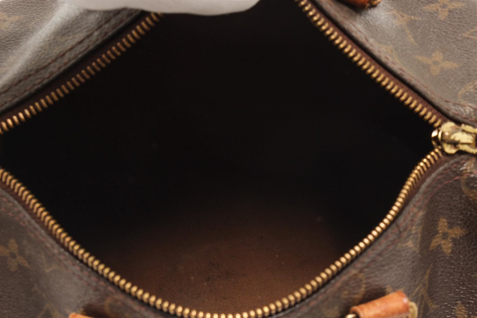 One Louis Vuitton Brown Monogram Speedy 25 Handbag. Item is sold AS-IS. All available information is listed in the description and shown in the photo. Louis Vuitton Brown Monogram Speedy 25 Handbag with gold tone hardware, monogram canvas, vachetta handles and trim, a top zip closure, and an interior pocket. 7.5" L x 9.8" W x 5.9" D, 3.5" drop / 19.05 L x 24.89 W x 14.98 D CM, 8.89 CM drop
