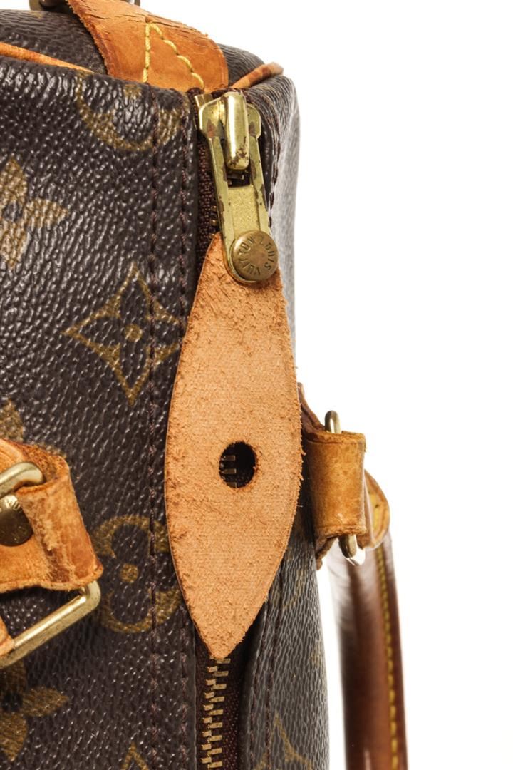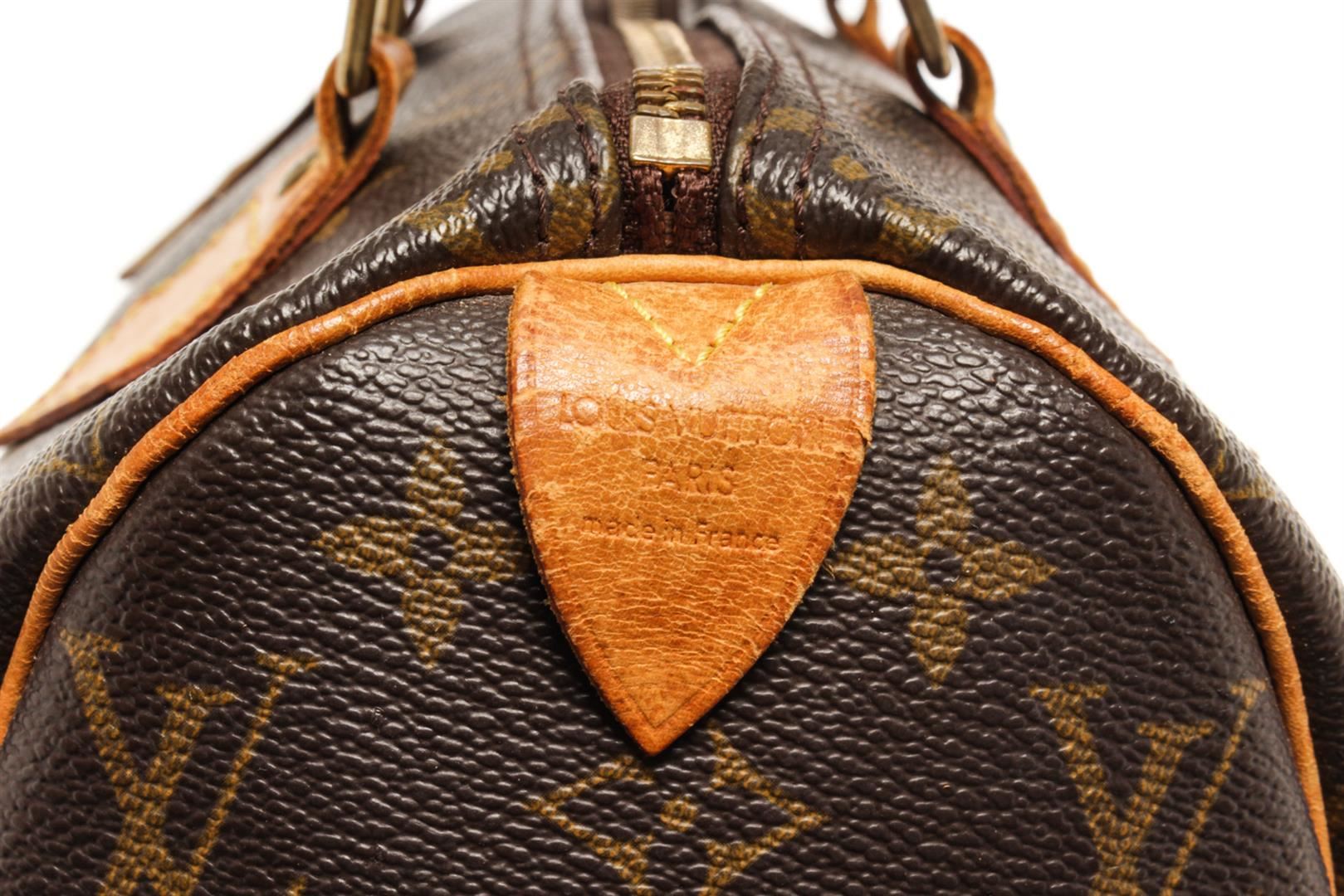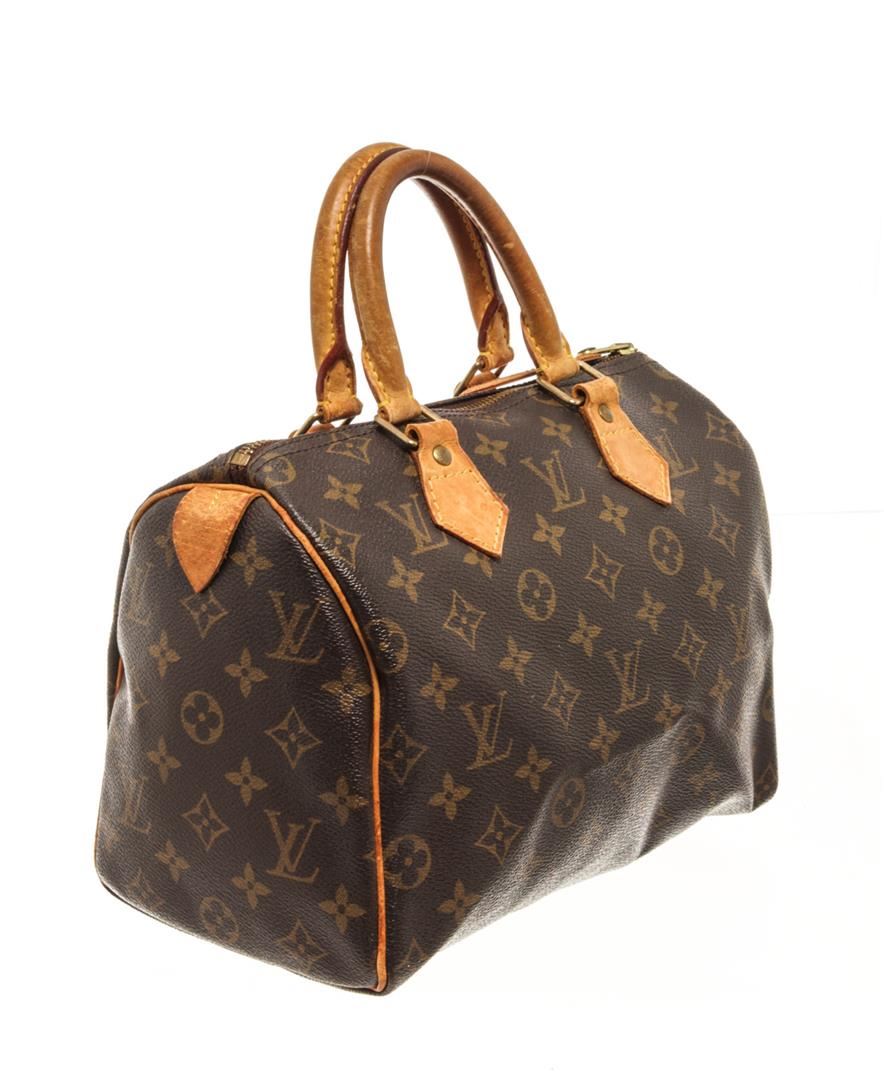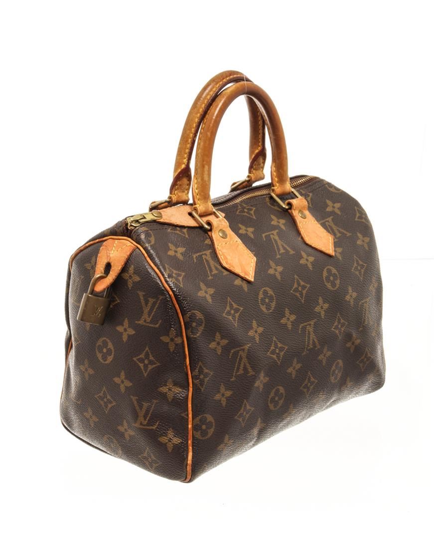 One Louis Vuitton Brown Monogram Speedy 25 Handbag. Item is sold AS-IS. All available information is listed in the description and shown in the photo. Louis Vuitton Brown Monogram Speedy 25 Handbag with brown canvas leather trim, monogram pattern circular top handles, top zip fastening main compartment, zip closure on top. Depth 4.7 in, Width 9.8 in / Depth 12 cm, Width 25 cm