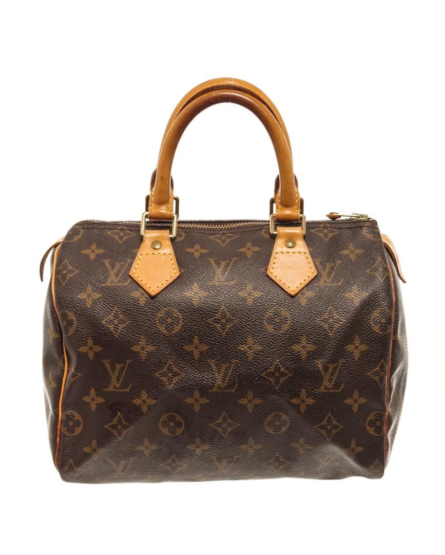 One Louis Vuitton Brown Monogram Speedy 25 Handbag. Item is sold AS-IS. All available information is listed in the description and shown in the photo. Louis Vuitton Brown Monogram Speedy 25 Handbag with gold tone hardware, monogram canvas, vachetta handles and trim, a top zip closure, and an interior pocket. 7.5" L x 9.8" W x 5.9" D, 3.5" drop / 19.05 L x 24.89 W x 14.98 D CM, 8.89 CM drop