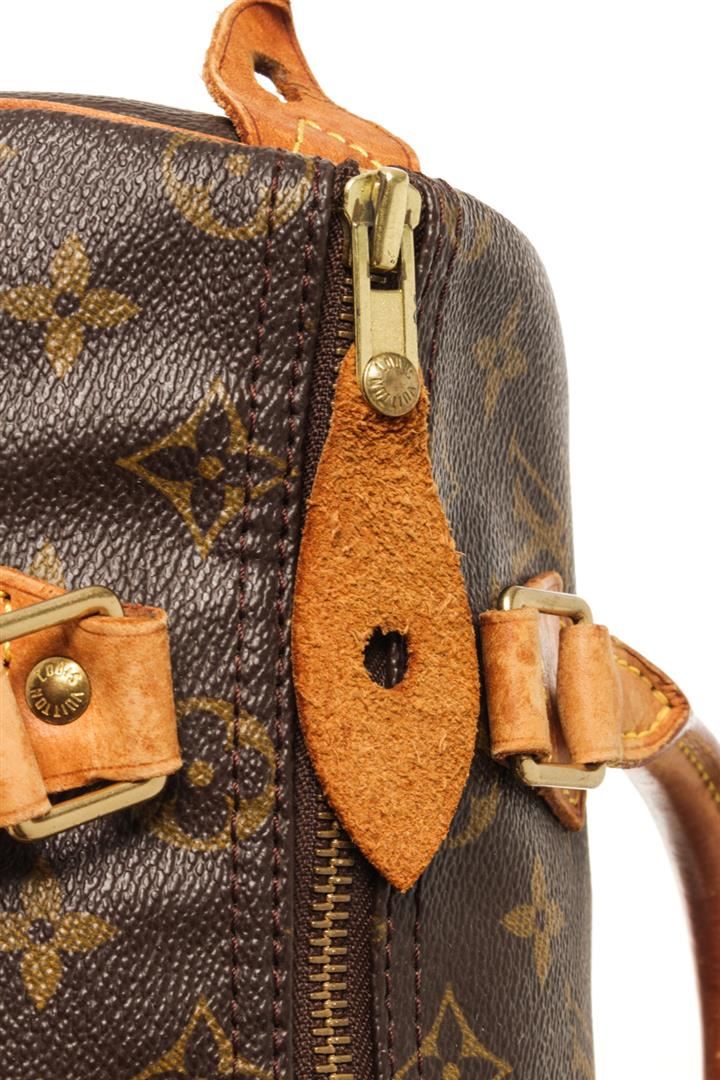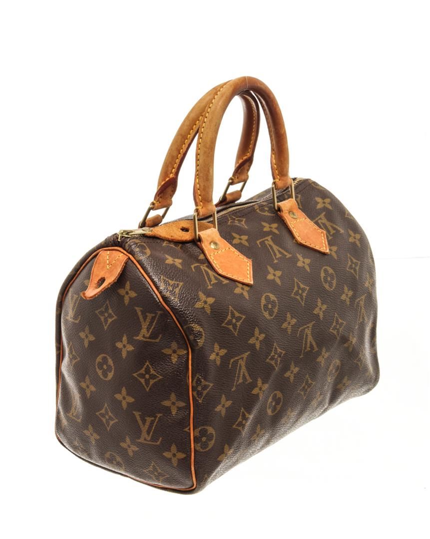 One Louis Vuitton Brown Monogram Speedy 25 Satchel Bag. Item is sold AS-IS. All available information is listed in the description and shown in the photo. Louis Vuitton Brown Monogram Speedy 25 Satchel Bag with gold tone hardware, brown, monogram canvas, vachetta handles and trim, a top zip closure, and an interior pocket. 7.5" L x 9.8" W x 5.9" D, 3.5" drop / 19.05 L x 24.89 W x 14.98 D CM, 8.89 CM drop