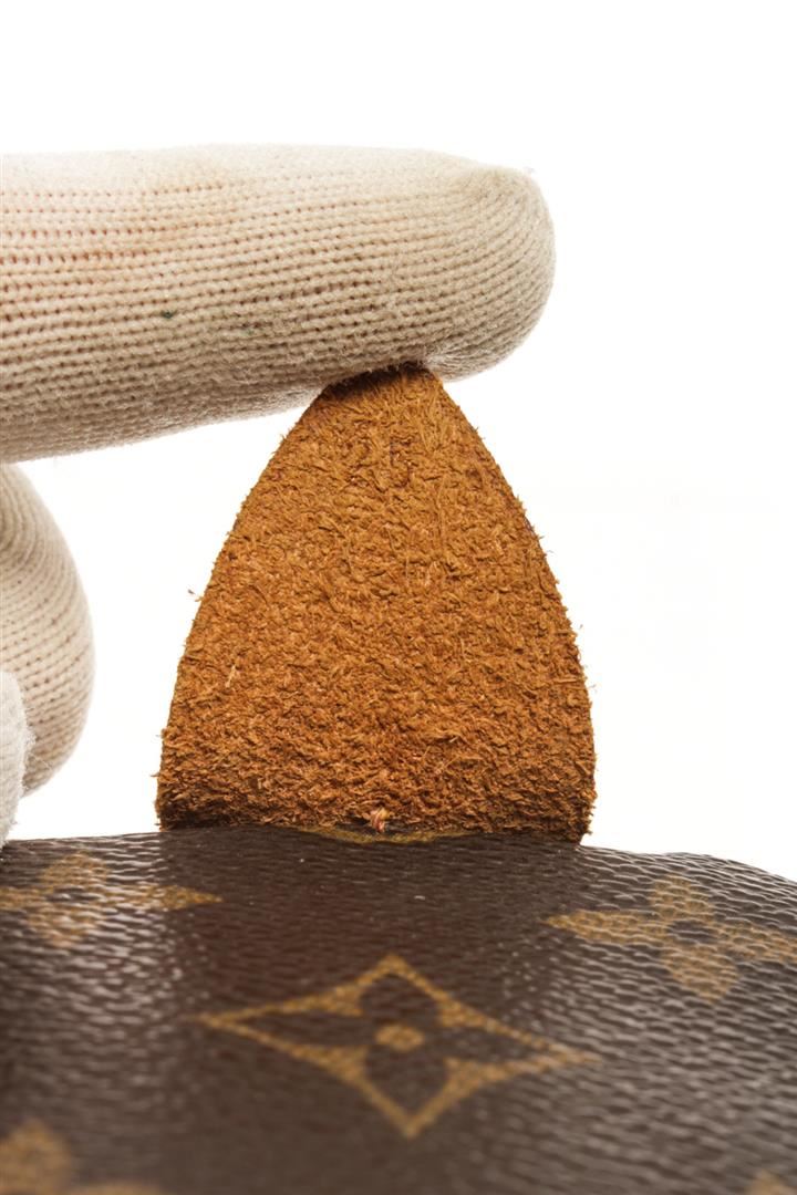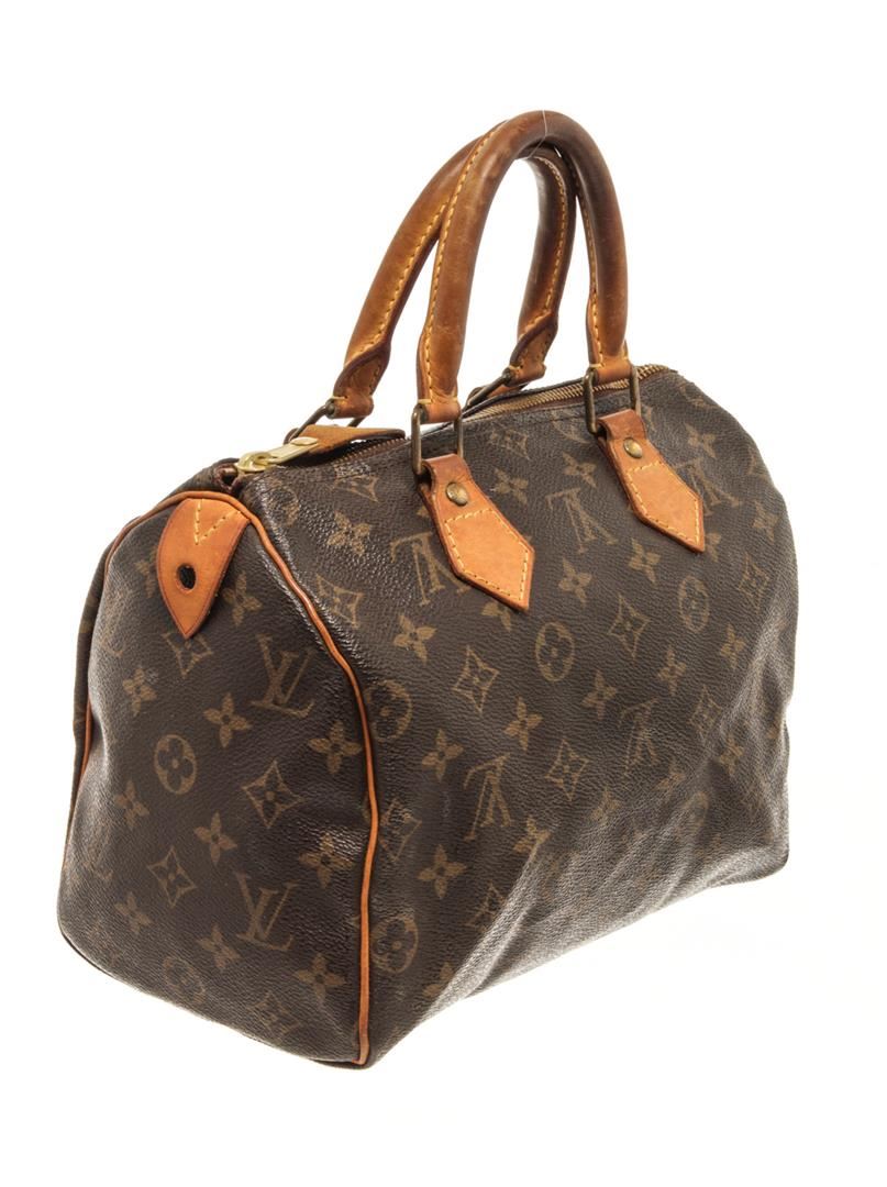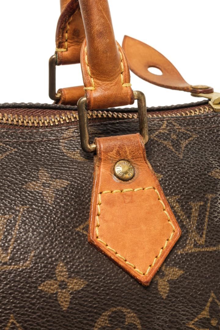 One Louis Vuitton Brown Monogram Speedy 25 Satchel Bag. Item is sold AS-IS. All available information is listed in the description and shown in the photo. Louis Vuitton Brown Monogram Speedy 25 Satchel Bag with gold tone hardware, brown canvas leather trim, monogram pattern circular top handles, top zip fastening main compartment, zip closure on top. Depth 4.7 in, Width 9.8 in / Depth 12 cm, Width 25 cm