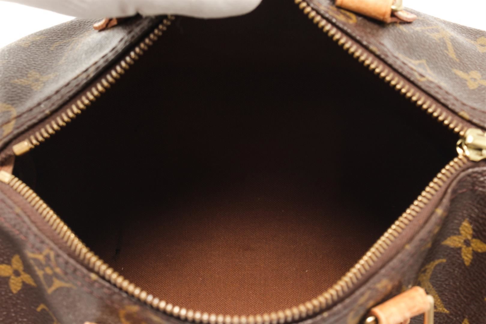 One Louis Vuitton Brown Monogram Speedy 25 Satchel Bag. Item is sold AS-IS. All available information is listed in the description and shown in the photo. Louis Vuitton Brown Monogram Speedy 25 Satchel Bag with gold tone hardware, brown, monogram canvas, vachetta handles and trim, a top zip closure, and an interior pocket. 7.5" L x 9.8" W x 5.9" D, 3.5" drop / 19.05 L x 24.89 W x 14.98 D CM, 8.89 CM drop