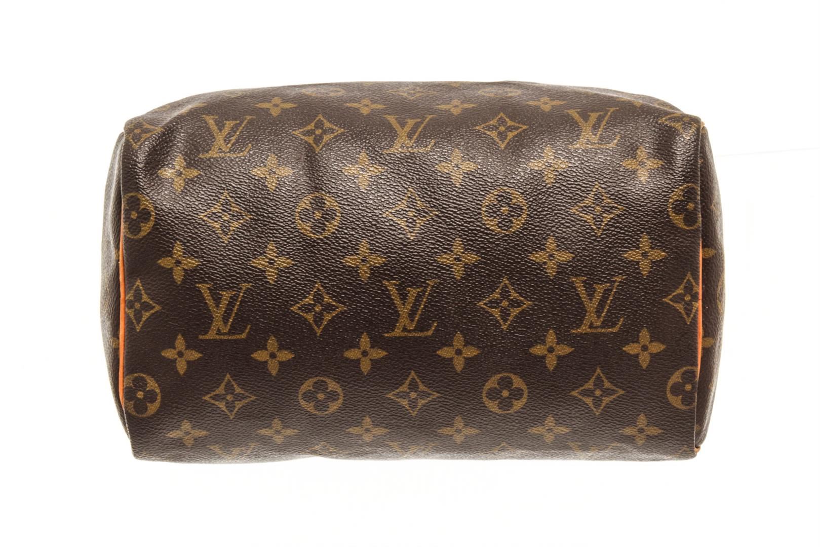 One Louis Vuitton Brown Monogram Speedy 25 Satchel Bag. Item is sold AS-IS. All available information is listed in the description and shown in the photo. Louis Vuitton Brown Monogram Speedy 25 Satchel Bag with gold tone hardware, brown, monogram canvas, vachetta handles and trim, a top zip closure, and an interior pocket. 7.5" L x 9.8" W x 5.9" D, 3.5" drop / 19.05 L x 24.89 W x 14.98 D CM, 8.89 CM drop
