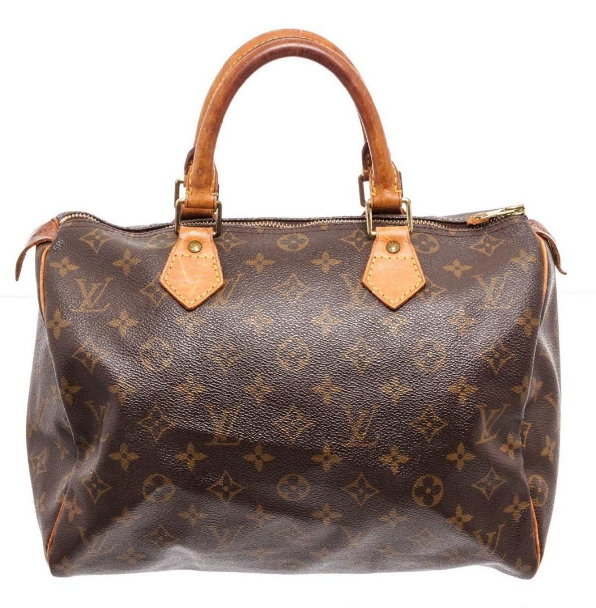 Louis Vuitton Brown Monogram Speedy 30cm Satchel. Louis Vuitton Brown Monogram Speedy 30cm Satchel with gold-tone hardware, Tan vachetta leather trim, interior slit pocket, canvas lining, dual rolled top handles, and zip closure. SIZE: Womens 30 cm